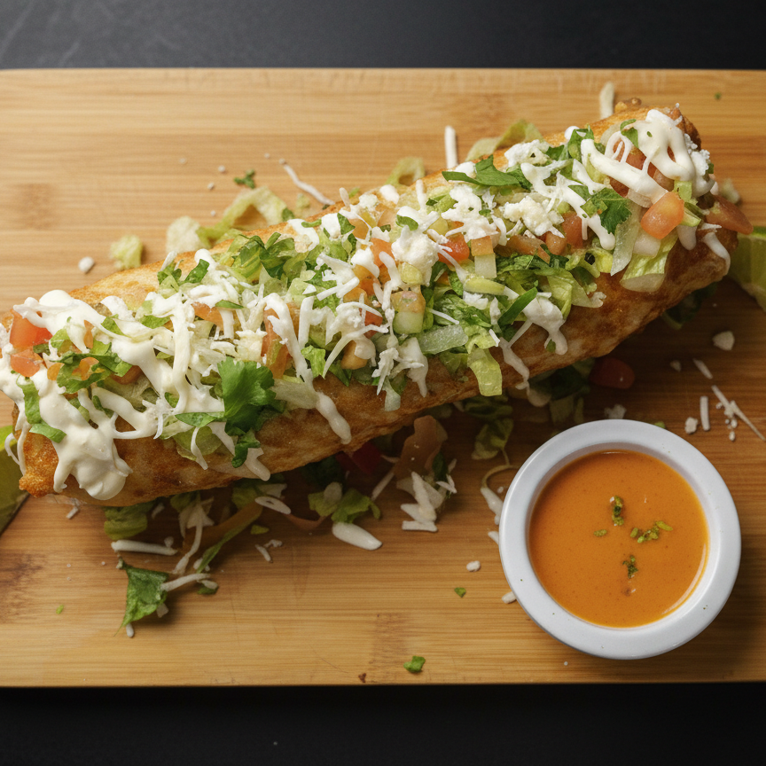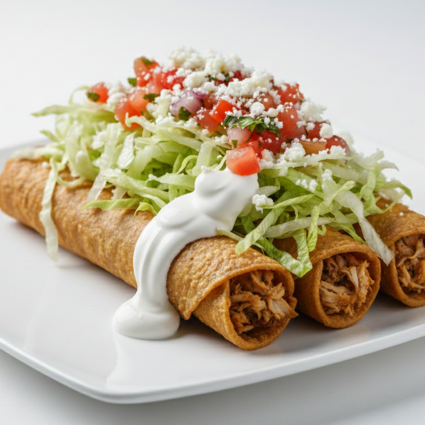 ¡Crujientes y llenos de sabor! 🌮✨ **Tacos Flauta Premium** Sumérgete en la perfección con nuestros 3 tacos flauta, rellenos a tu elección con jugoso pollo o carne mechada. Cada bocado es una fiesta de texturas: crujiente tortilla, fresca lechuga, vibrante pico de gallo, suave queso blanco y un toque cremoso de natilla. ¡Una explosión de sabor que te encantará!