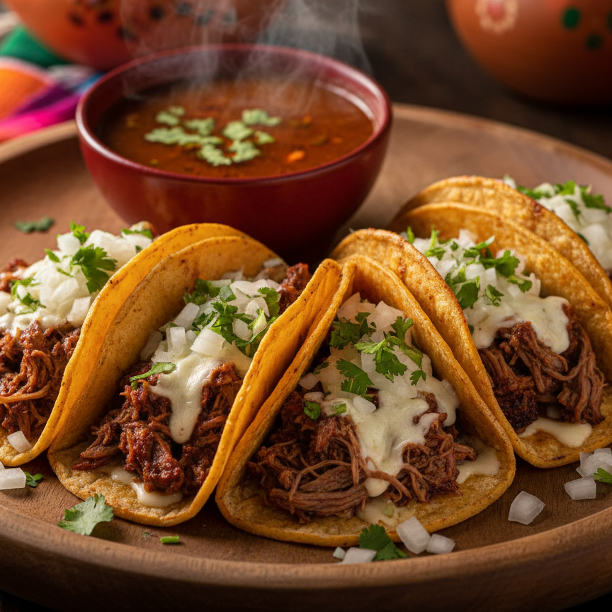 ¡Tus sentidos se van a México! 🌮🔥 Cuatro tacos de quesabirria jugosa, rellenos de carne suave y queso fundido, listos para sumergirse en nuestra salsa especial. ¡Una explosión de sabor en cada mordisco!
