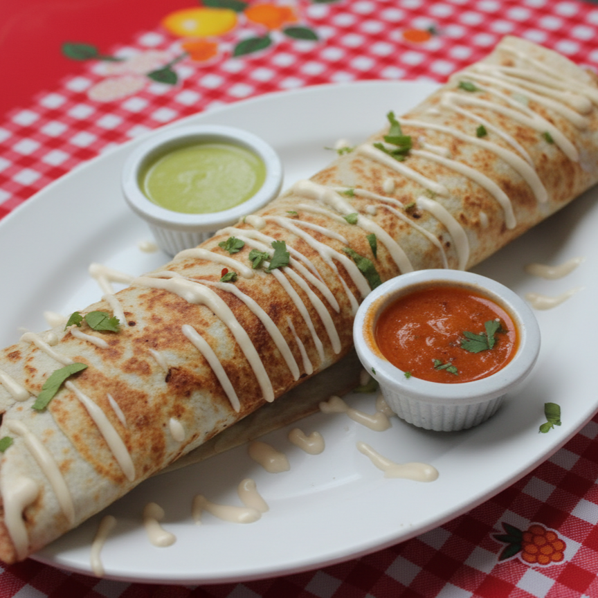 Nuestra tortilla de trigo de 33 cm, perfectamente enrollada, es una explosión de sabor. Rellena generosamente con frijolitos cremosos, pico de gallo vibrante, lechuga fresca, queso derretido, natilla suave y tu elección de carnita al gusto. ¡Es la perfección en cada bocado!