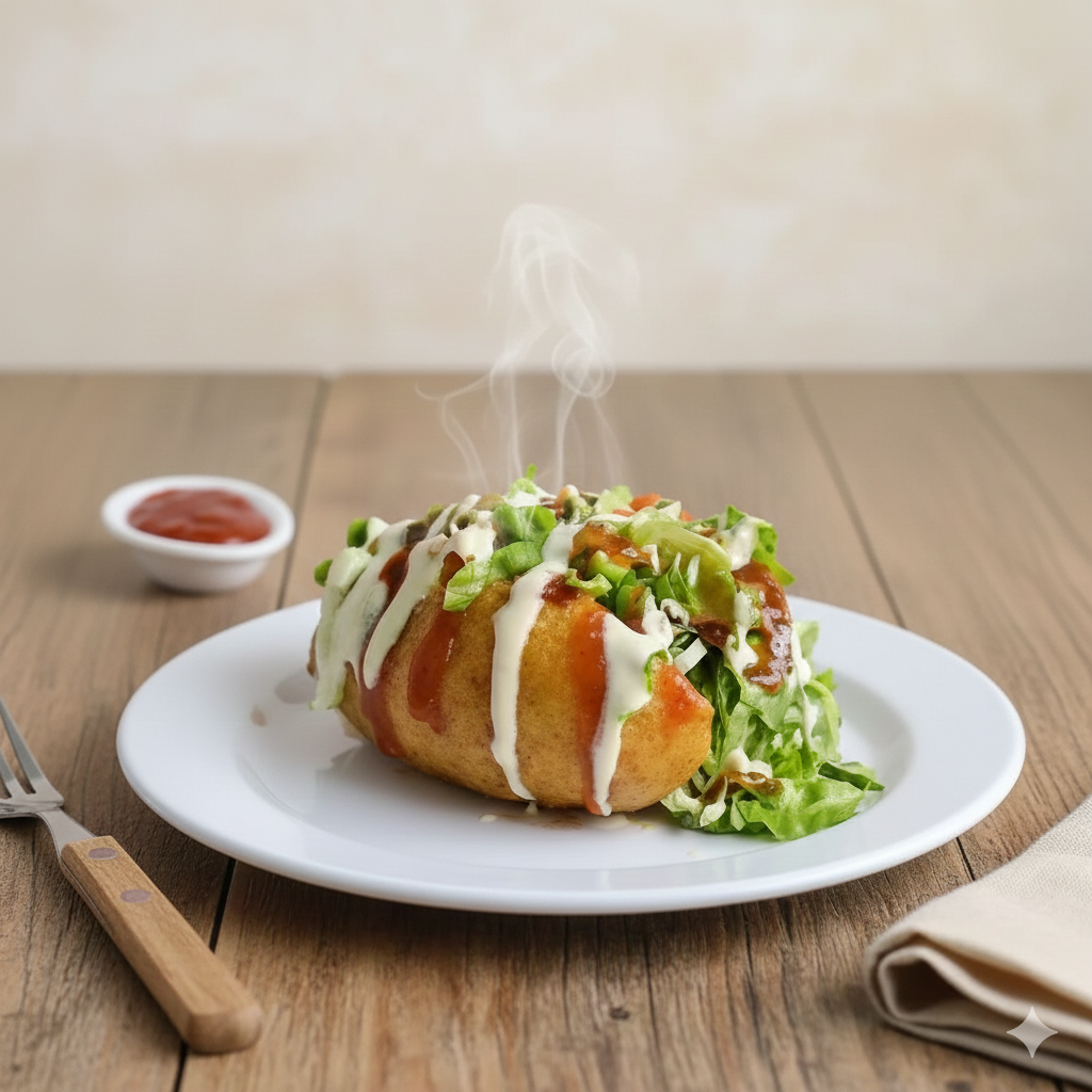 Maíz cascado rellena de carne, frijol, pollo, y queso con repollo y salsas caseras.