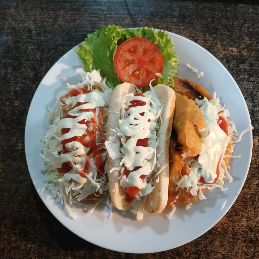 Pan ,salchichon,lechuga,tomate,,salsas de la casa y queso amarillo