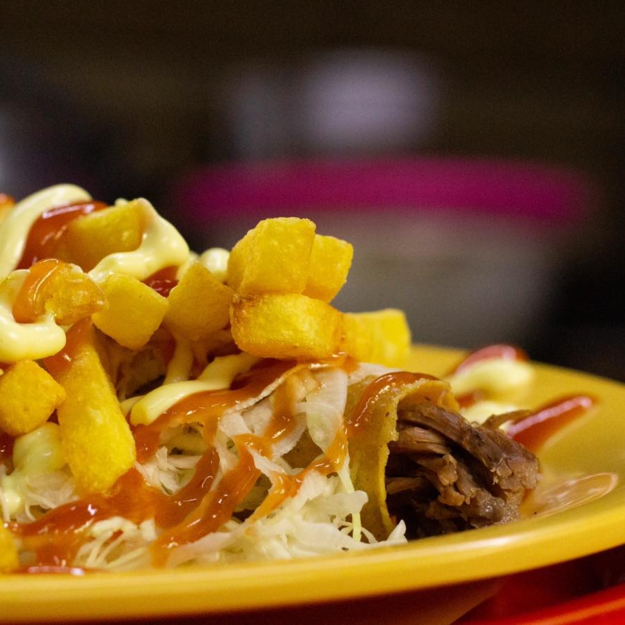 Pan de hamburguesa, carne mechada, queso blanco, repollo, salsa de tomate y mayonesa
