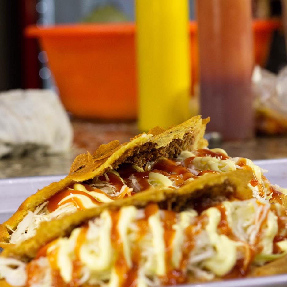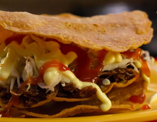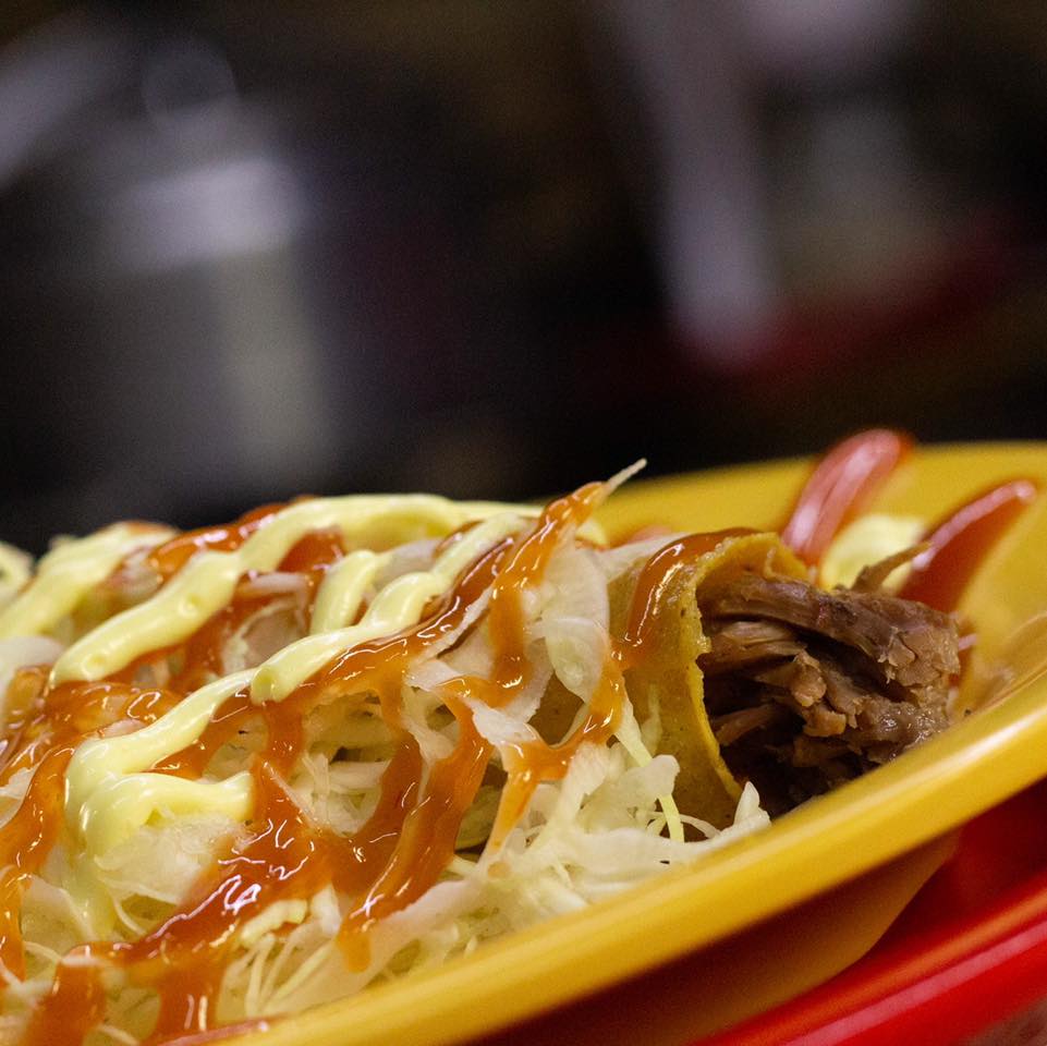 Taco tico con repollo, salsa casera con picante, tomate y mayonesa