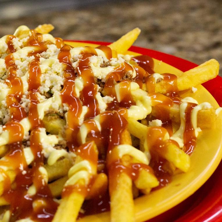 Nachos de Carne (1 porcion personal ) Doraditas, carne de res desmechada , frijol, pico de gallo,salsa de queso cheddar ,salsa de tomate y mayonesa.