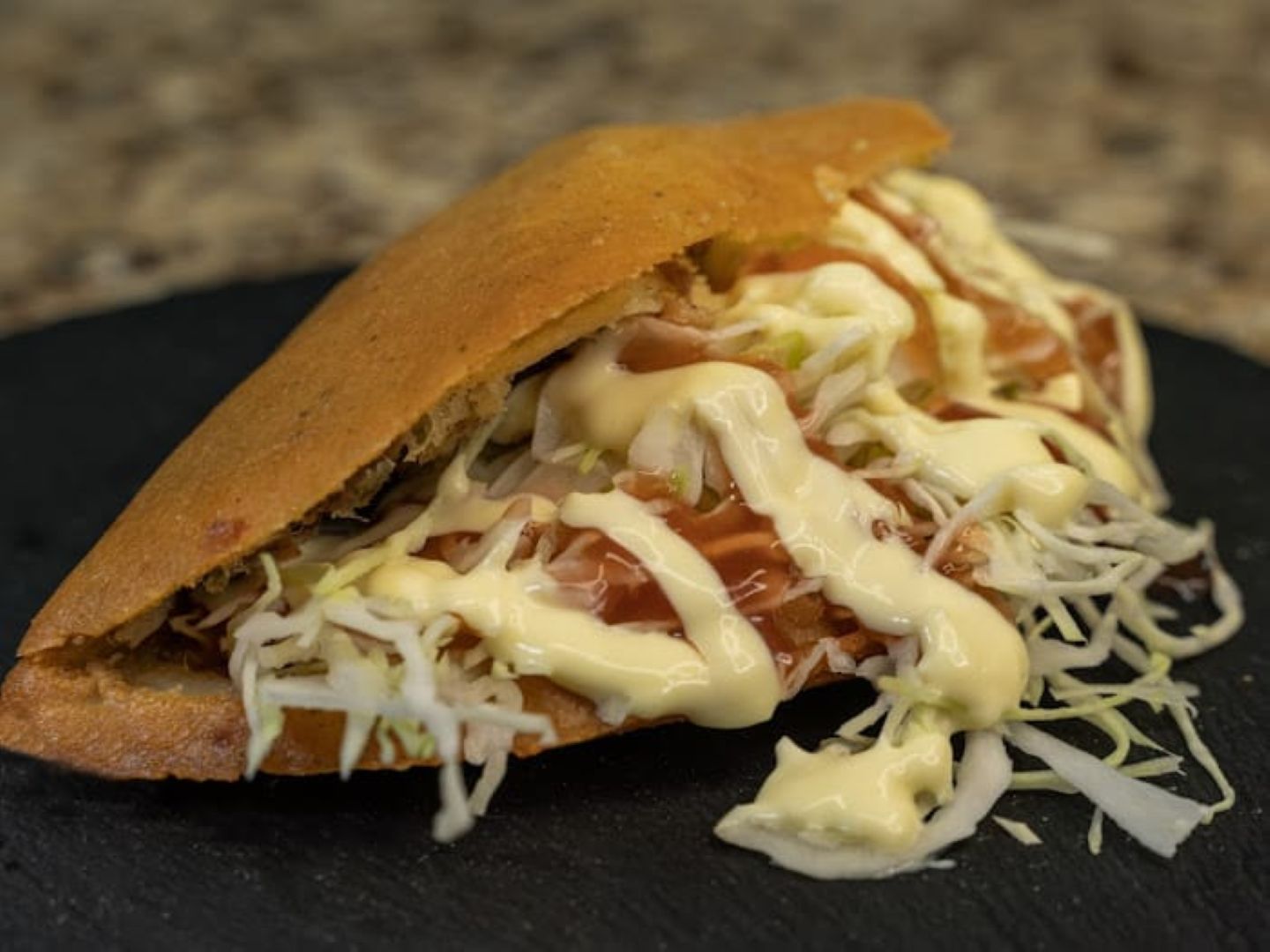 Dos tortillas crujientes, rellenas de carne mechada, frijoles, queso, repollo, salsa de tomate Kétchup y nuestra deliciosa mayonesa casera.