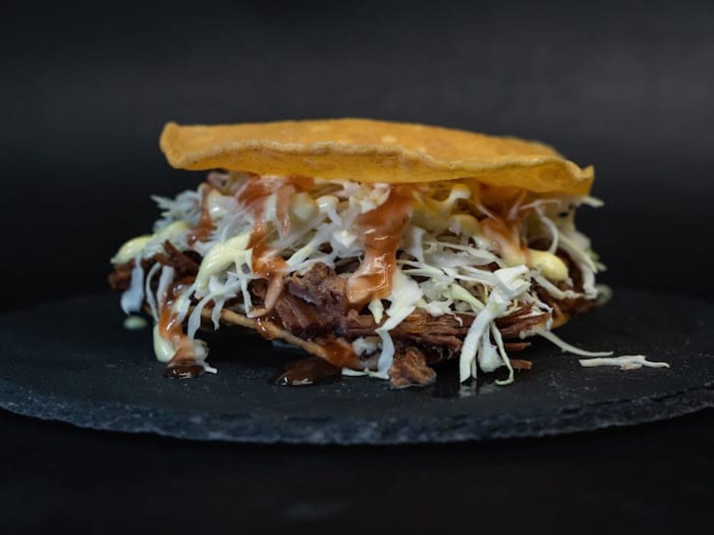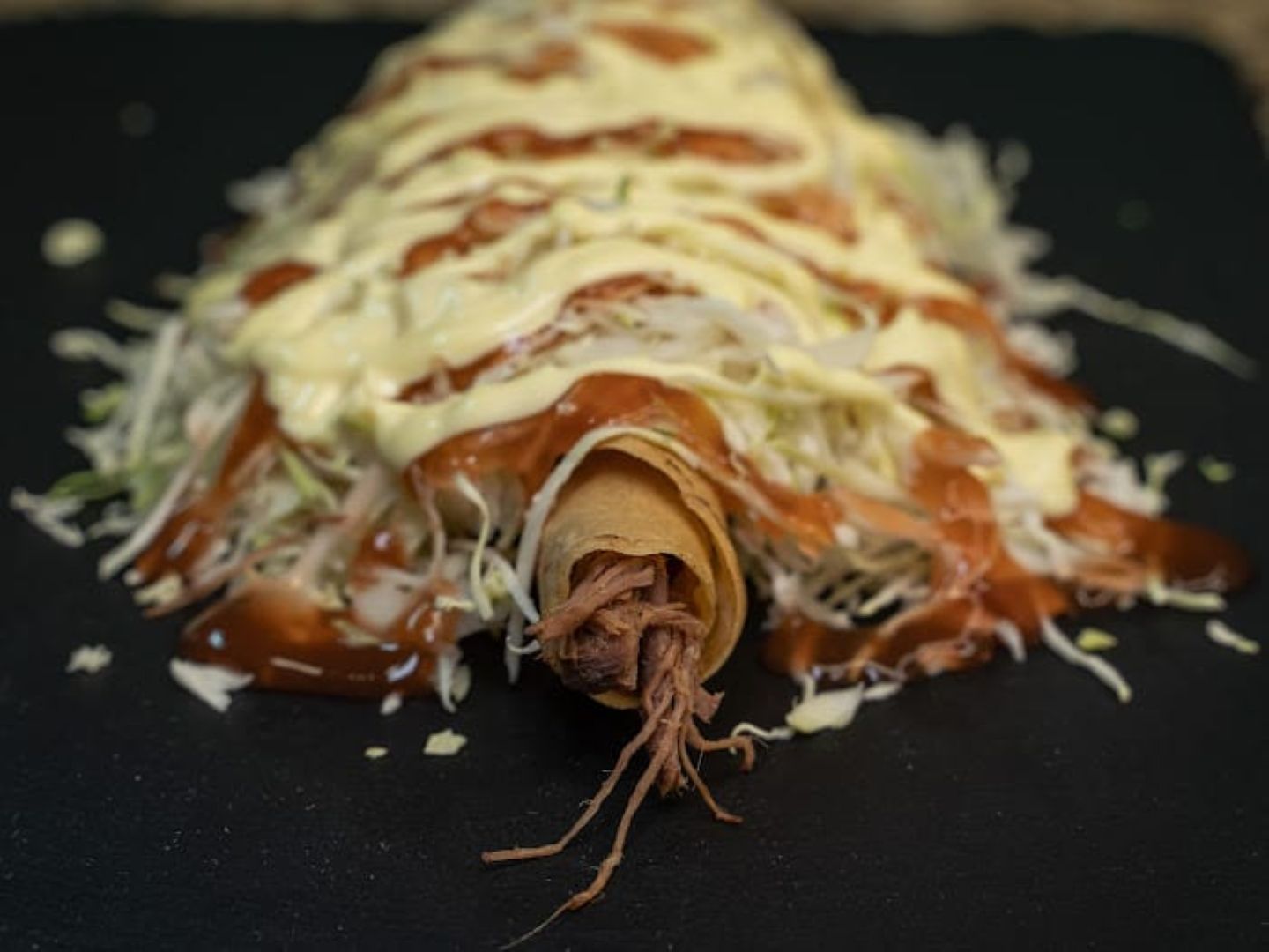 Tortilla de Maíz envuelta con jugosa carne mechada, acompañado de fresco repollo, cremosa mayonesa de la casa y salsa de tomate, creando un bocado lleno de sabor y texturas que se derriten en la boca.