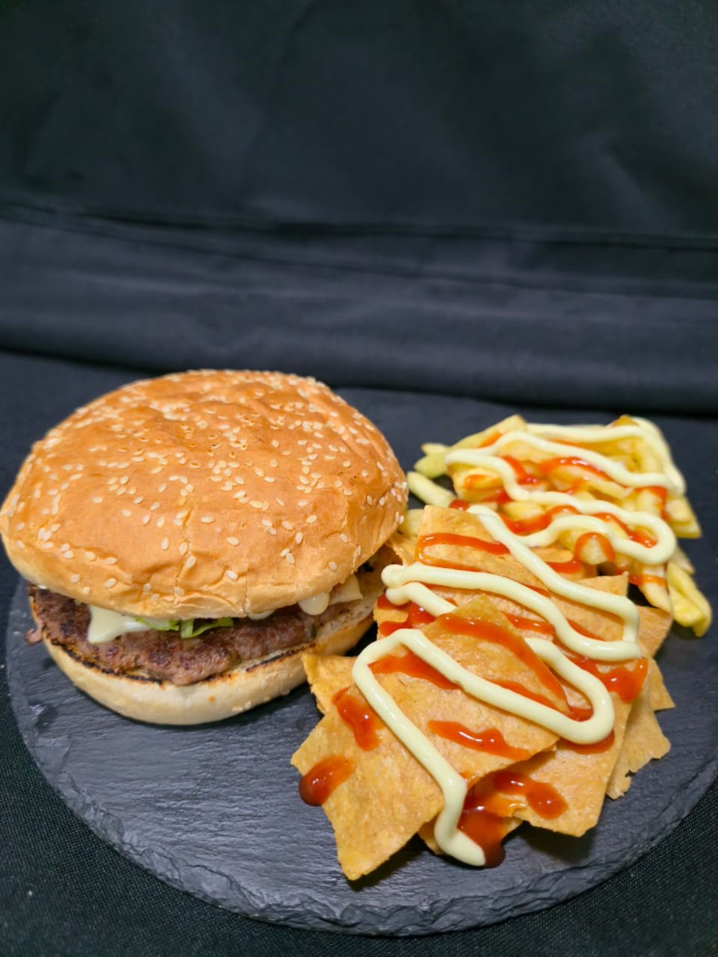 Suave pan de hamburguesa que envuelve una torta de carne casera jugosa, acompañada de queso, fresca lechuga, con salsa de tomate y cremosa mayonesa casera, creando un bocado delicioso y lleno de sabor. Viene acompañada de doraditas y papas a la francesa.