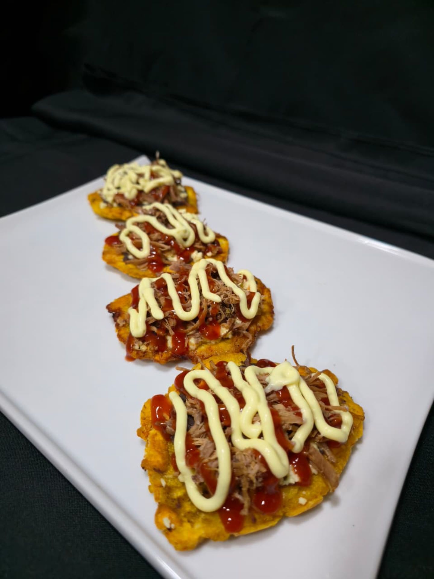 Cinco crujientes y deliciosos patacones servidos con carne mechada queso blanco, frijoles, deliciosa salsa de tomate y cremosa mayonesa casera, logrando una combinación irresistible de sabores y texturas.