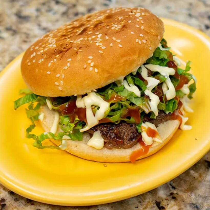 Pan de hamburguesa, torta de carne, lechuga, salsa de tomate y mayonesa