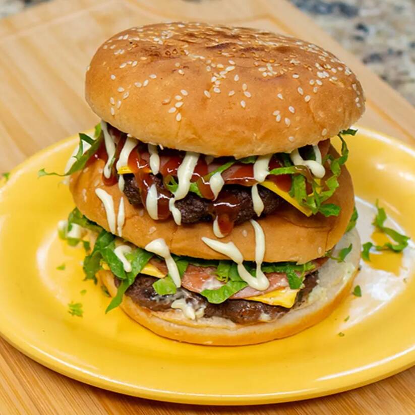 3 pan de hamburguesa, 2 tortas de carne caseras a la plancha, 2 jamon, 2 queso, lechuga, salsa tomate y mayonesa.