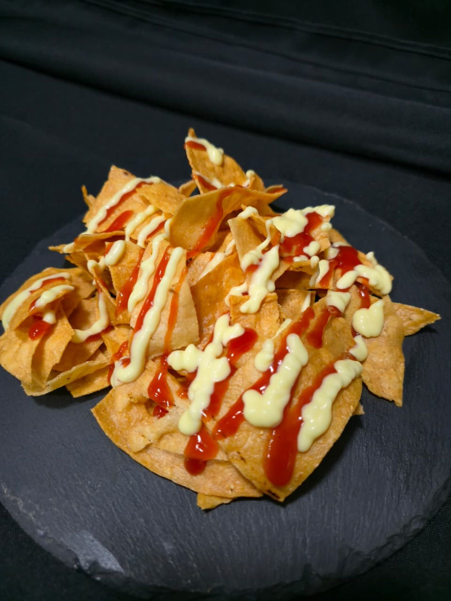 Crujientes tortillas de maíz, cubiertas con queso amarillo, jugosa carne mechada, frijoles, acompañadas de deliciosa salsa de tomate y nuestra cremosa mayonesa casera, creando un bocado irresistible, lleno de sabor y perfecto para compartir.