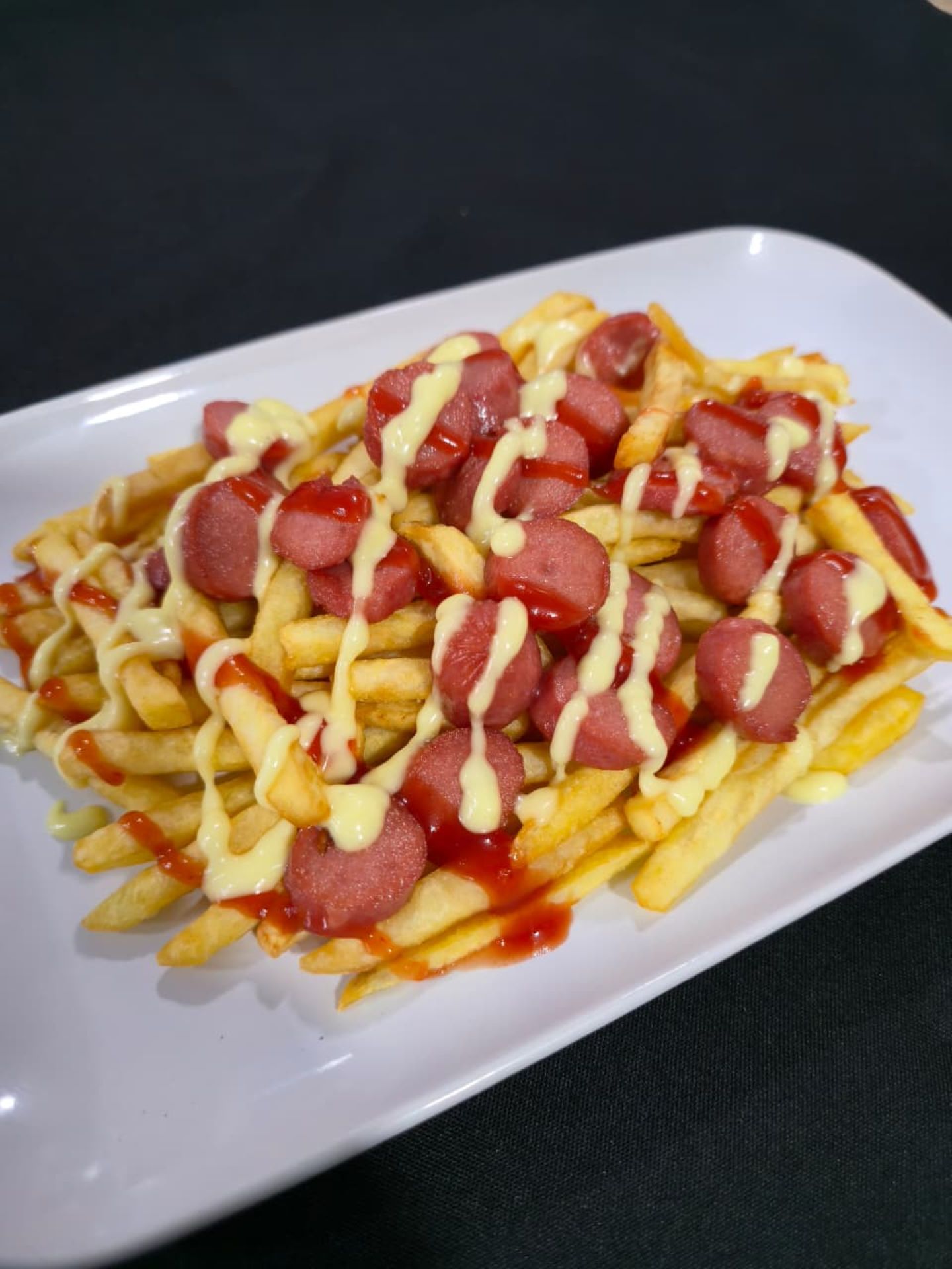 Crujientes papas a la francesa acompañadas de salchichas doradas y una combinación de salsa de tomate Kétchup y nuestra deliciosa mayonesa casera, creando un bocado delicioso y lleno de sabor que encanta a grandes y chicos.