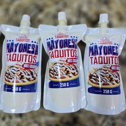 Crujientes tortillitas de maíz doradas, bañadas en salsa de tomate y acompañadas de nuestra cremosa mayonesa casera, creando un bocado irresistiblemente delicioso