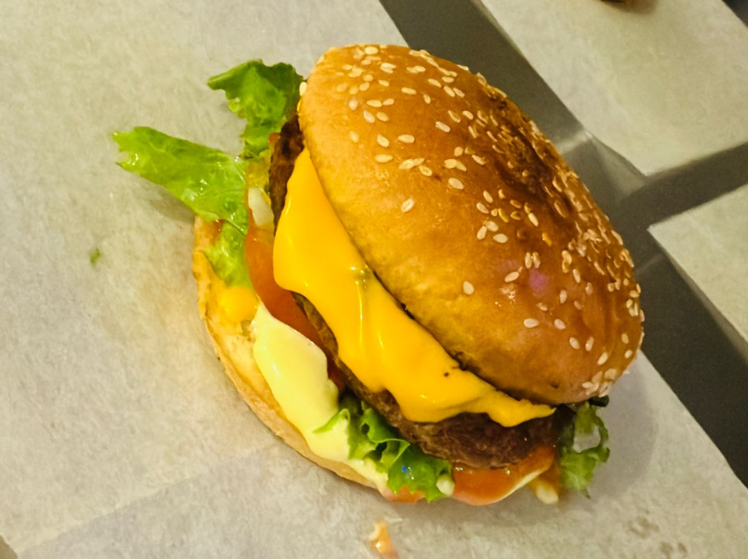 Con salsa de queso,torta de carne,lechuga,tomate,pepinillos,salsa de tomate y mayonesa con papas ala francesa