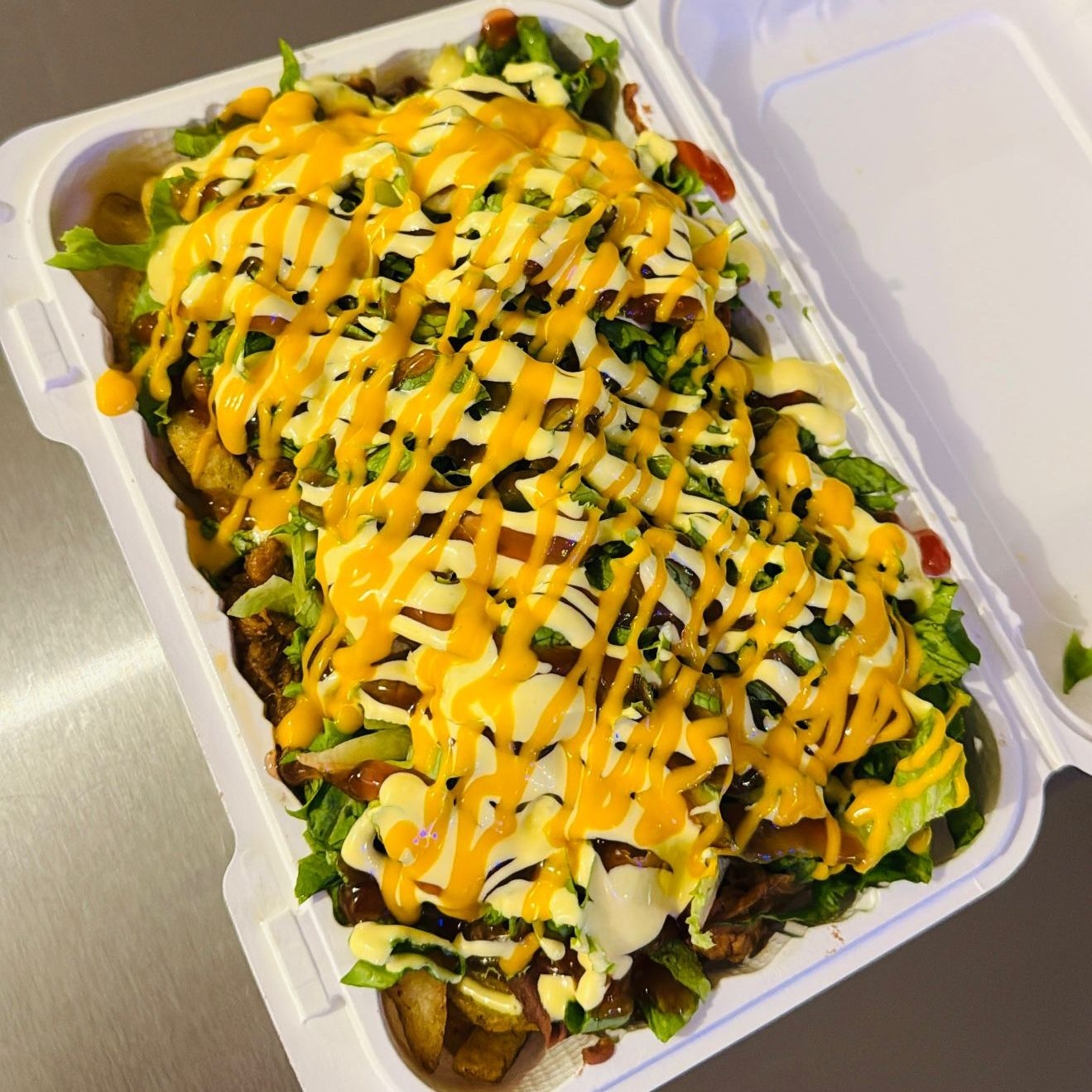 Unas ricas papas ala francesa con frijoles molidos,lechuga,Carne mechada,salsa de tomate,salsa de queso y mayonesa