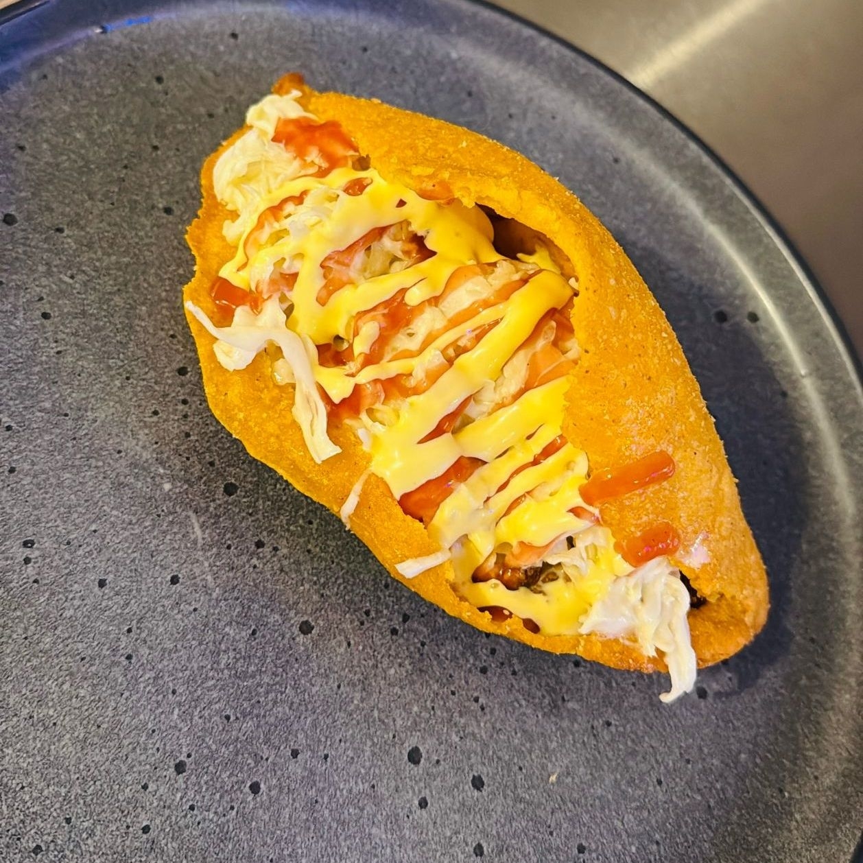 Una crujiente tortilla de maíz con carne mechada,ensalada de repollo,salsa de tomate y mayonesa