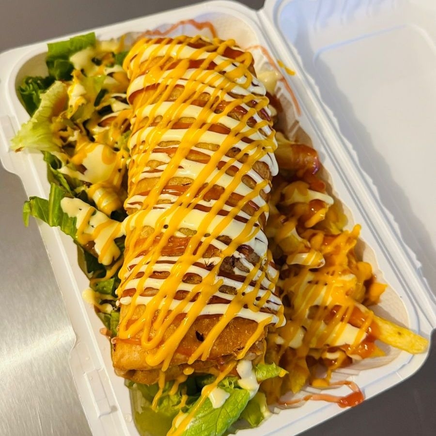 Deliciosa tortilla de harina con queso y carne mechada,lechuga,papitas con salsa de queso, salsa de tomate y mayonesa con su respectiva bebida a elegir horchata o te frio de limon