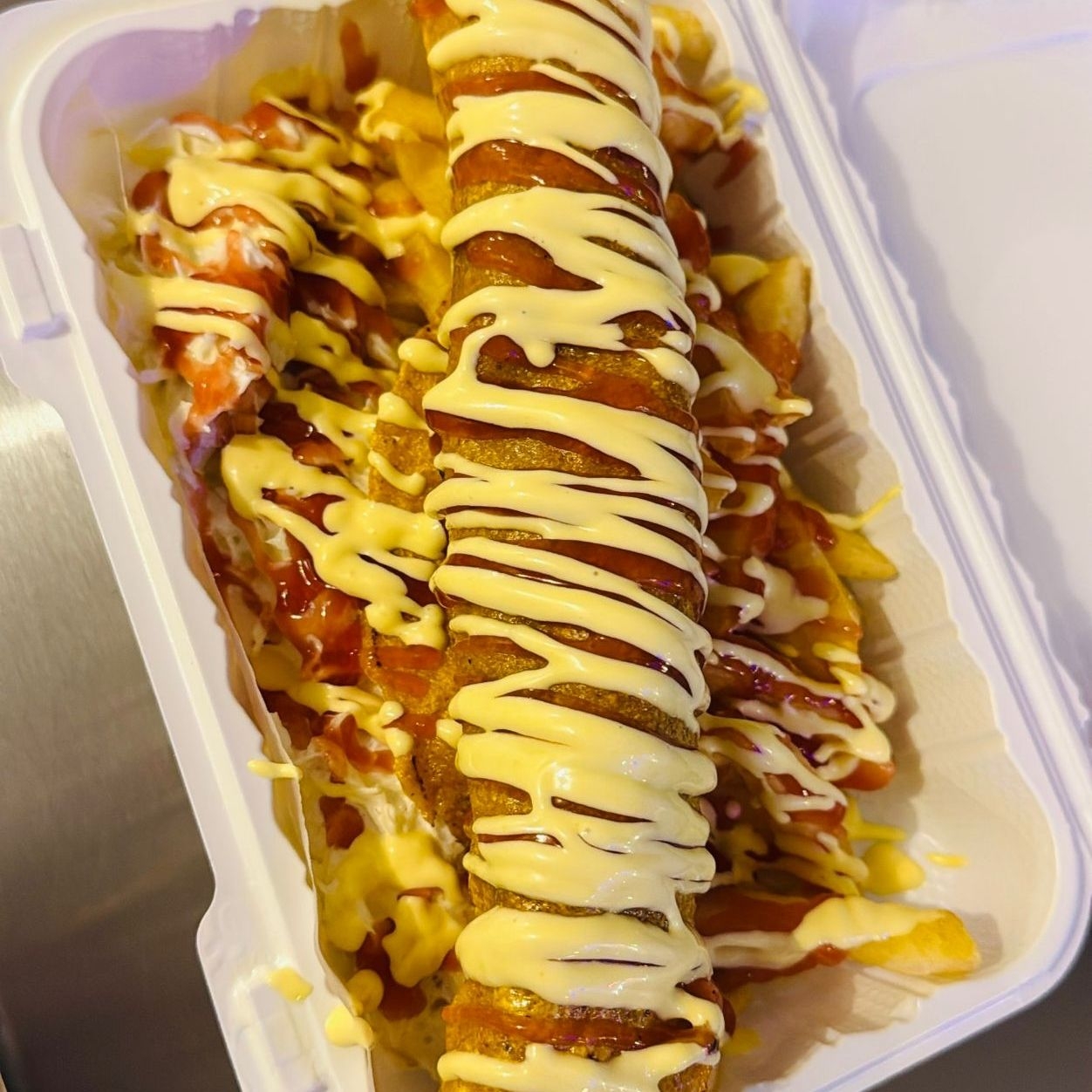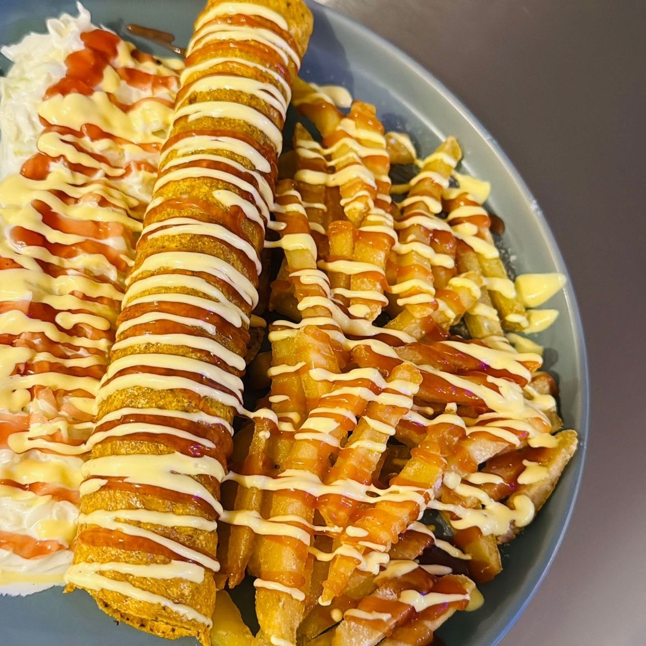 Deliciosas papas ala francesa con salsa de queso,salsa de tomate y mayonesa