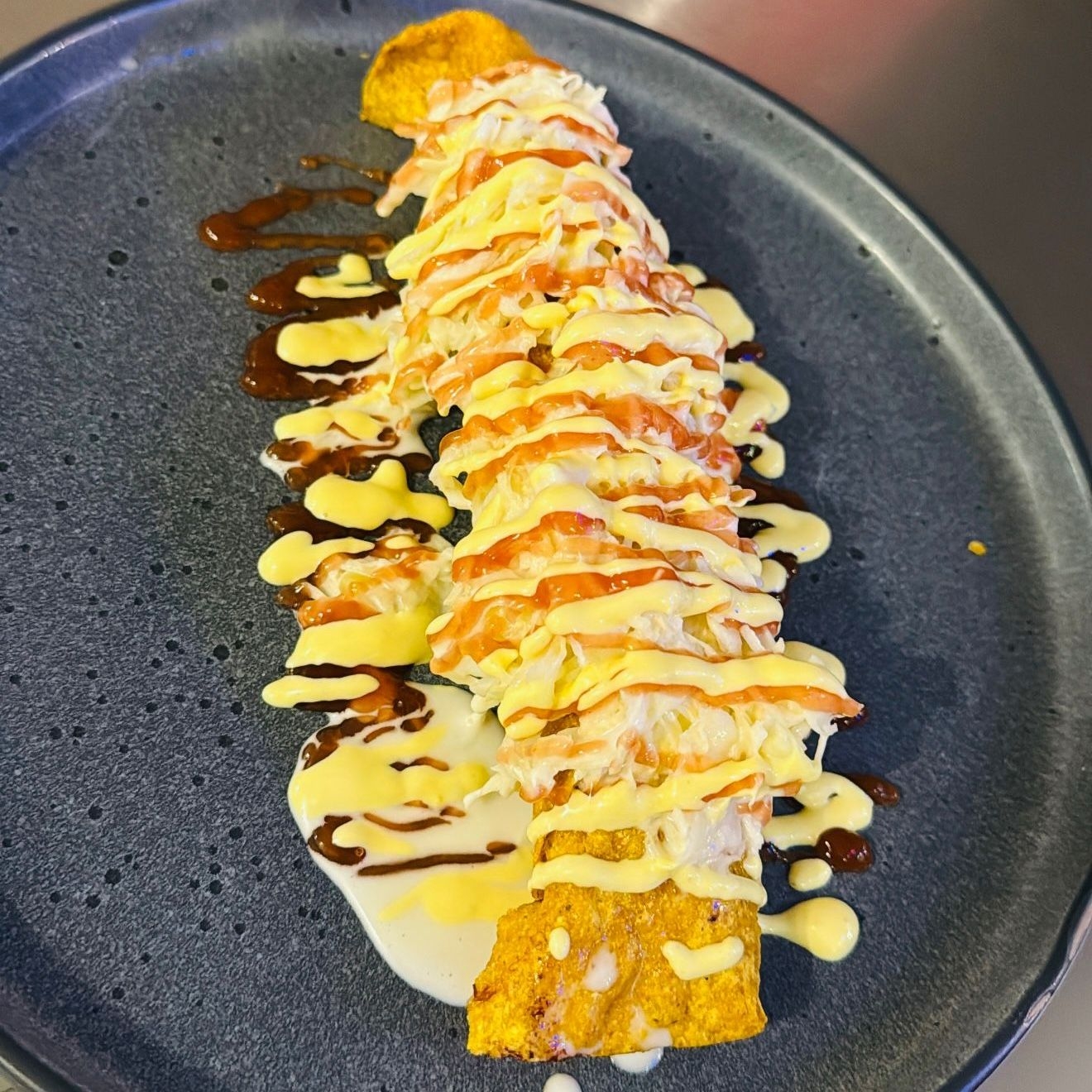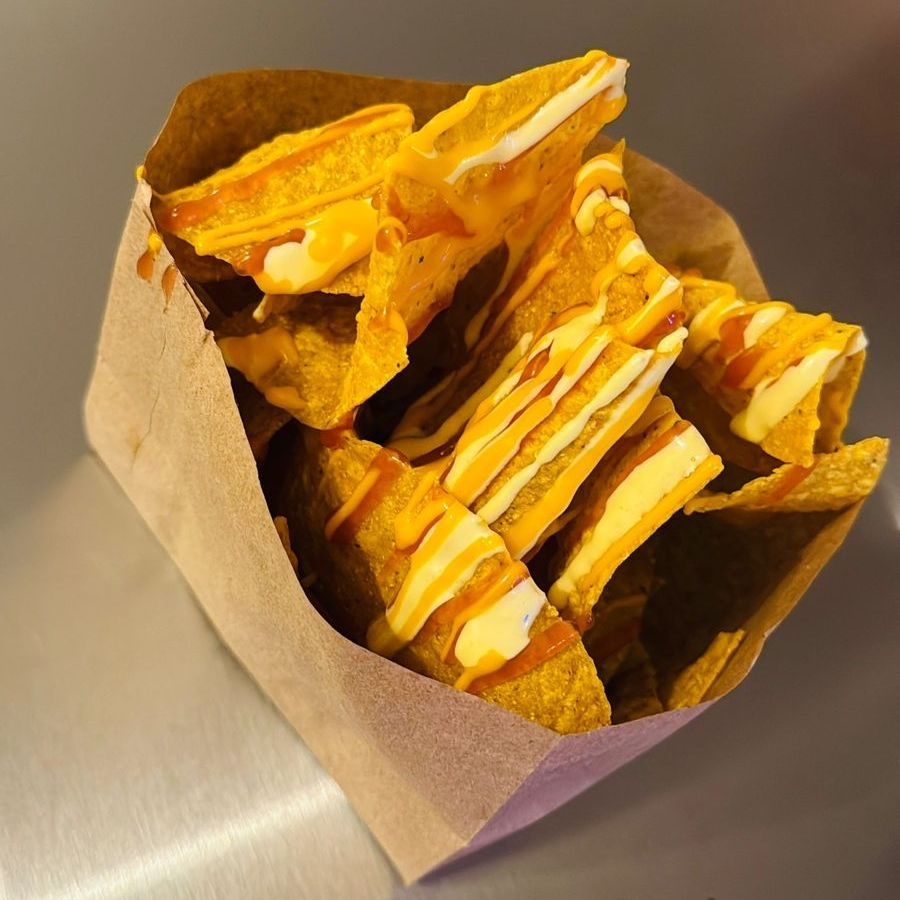 Tortillitas crujientes con salsa de tomate,salsa de queso y mayonesa