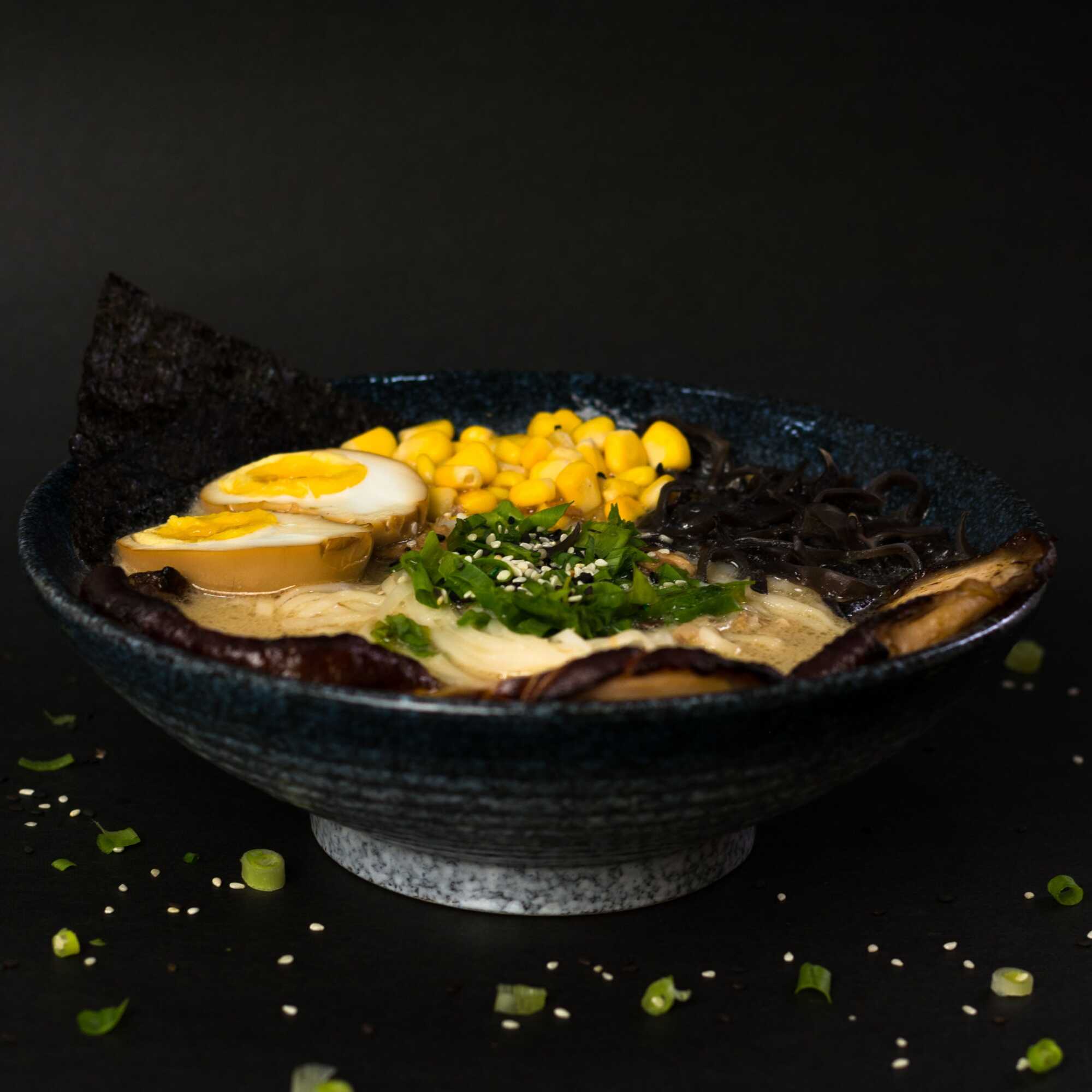 fideos artesanales con panceta de cerdo, hongos, alga, maíz dulce, cebollino, ajonjolí, huevos con salsa de soya