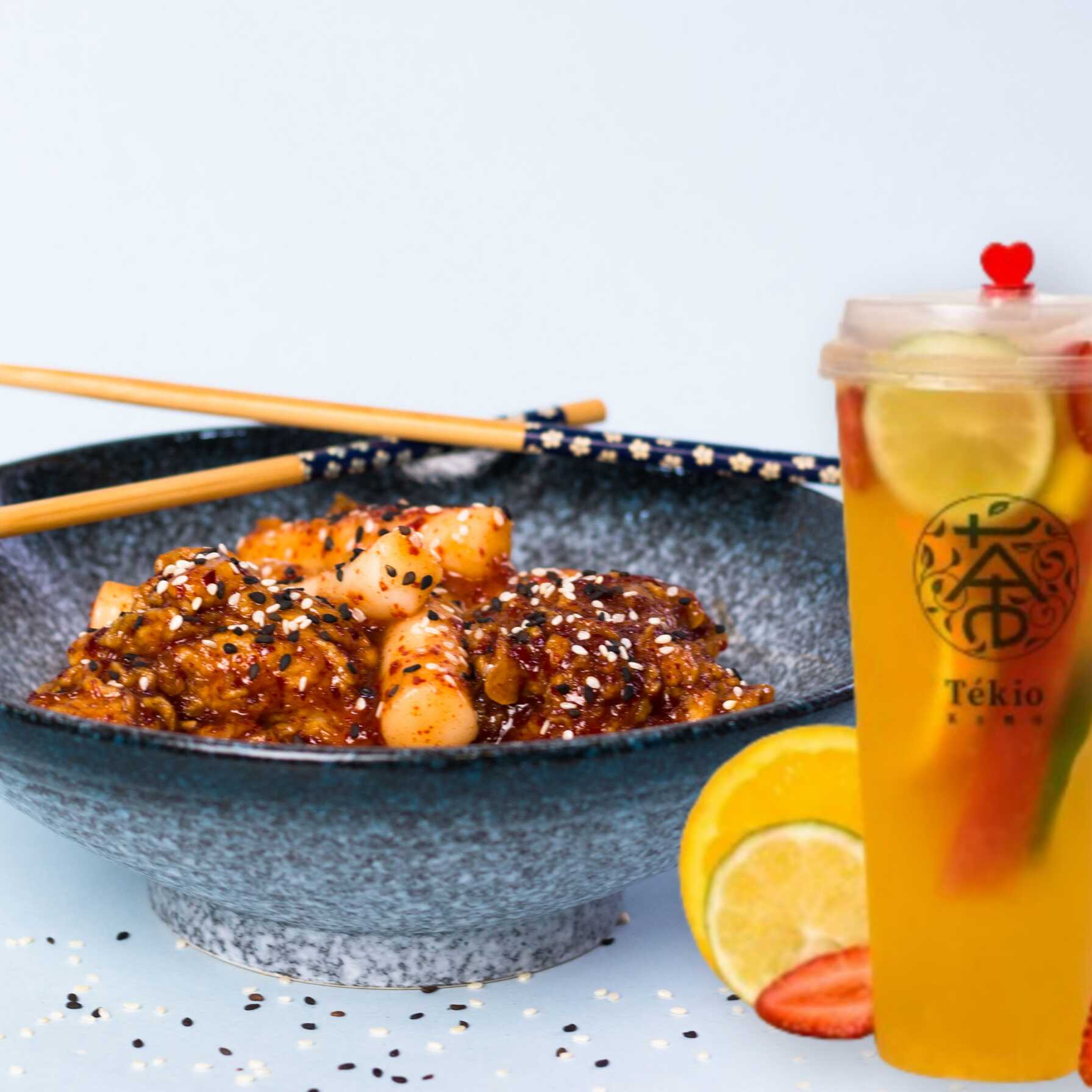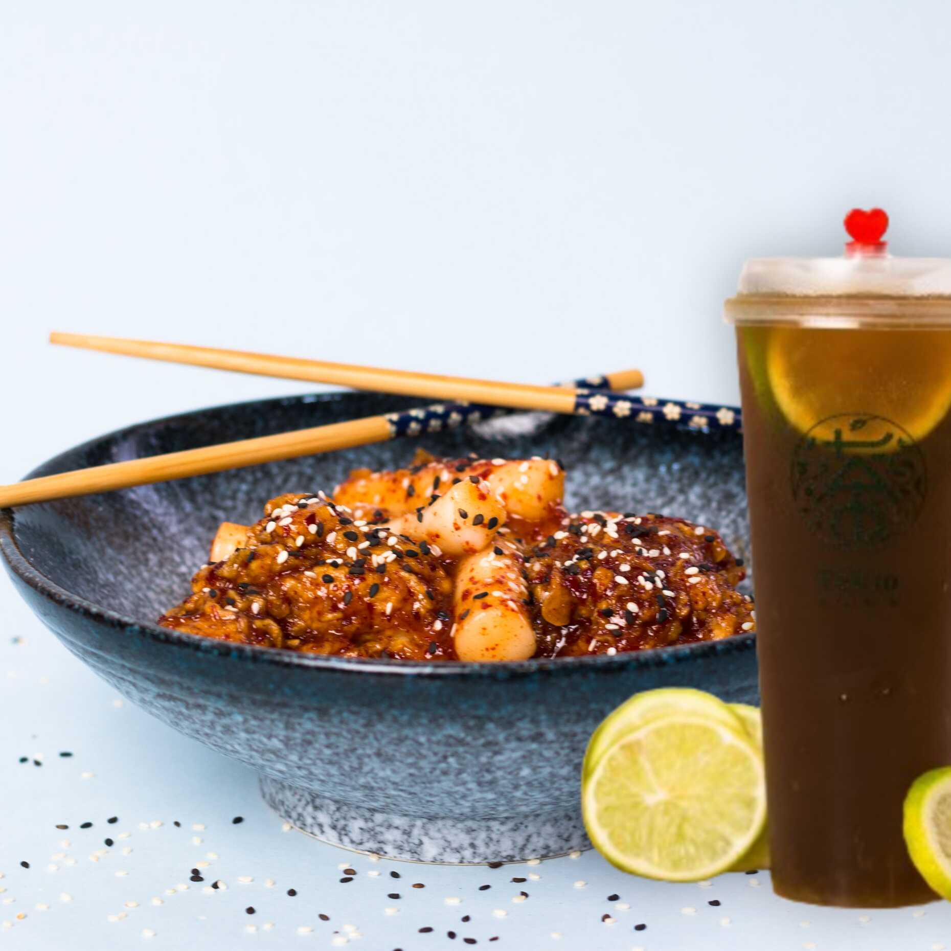 5 piezas de pollo bañadas en salsa coreana con 5 unidades de teobokki