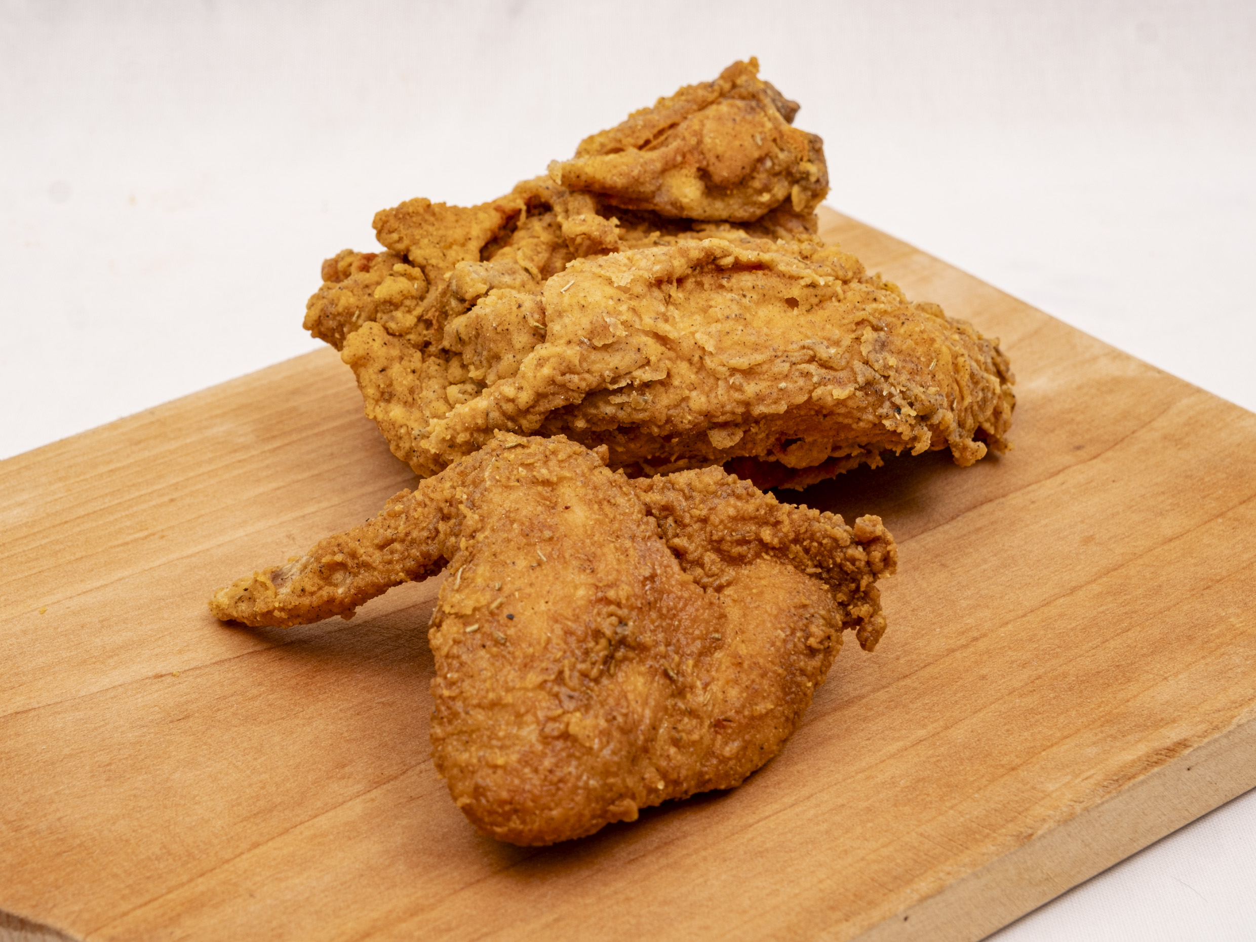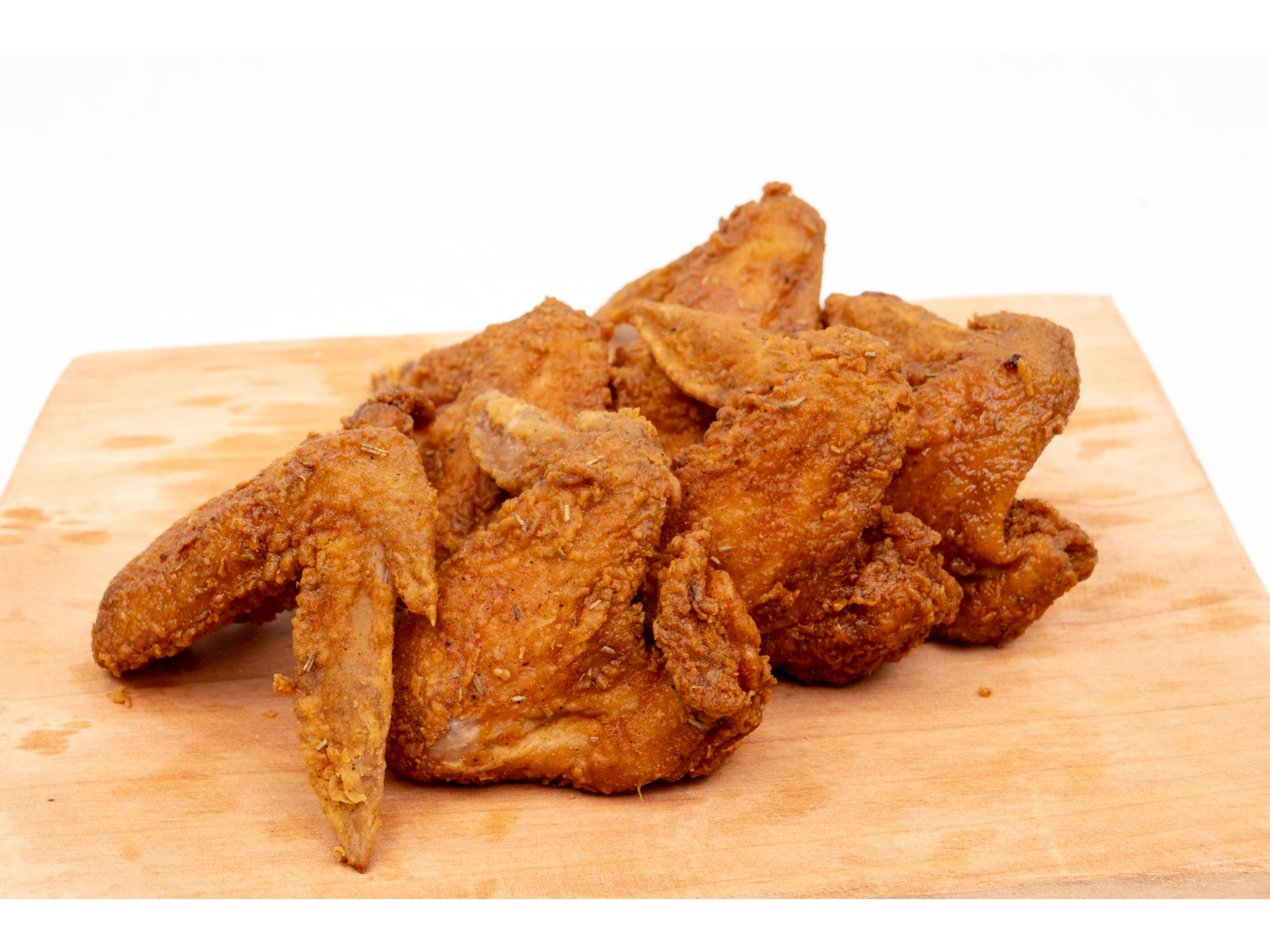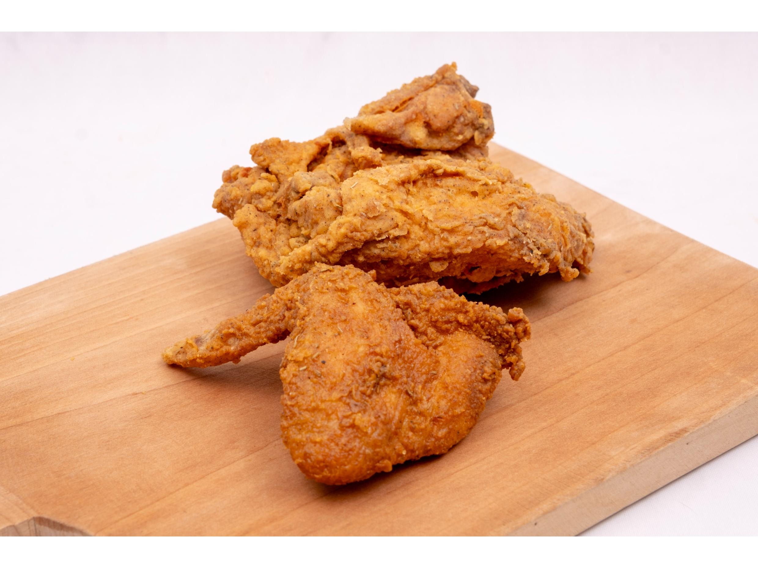 Pechuga y ala de pollo frito acompañada de tortillas.