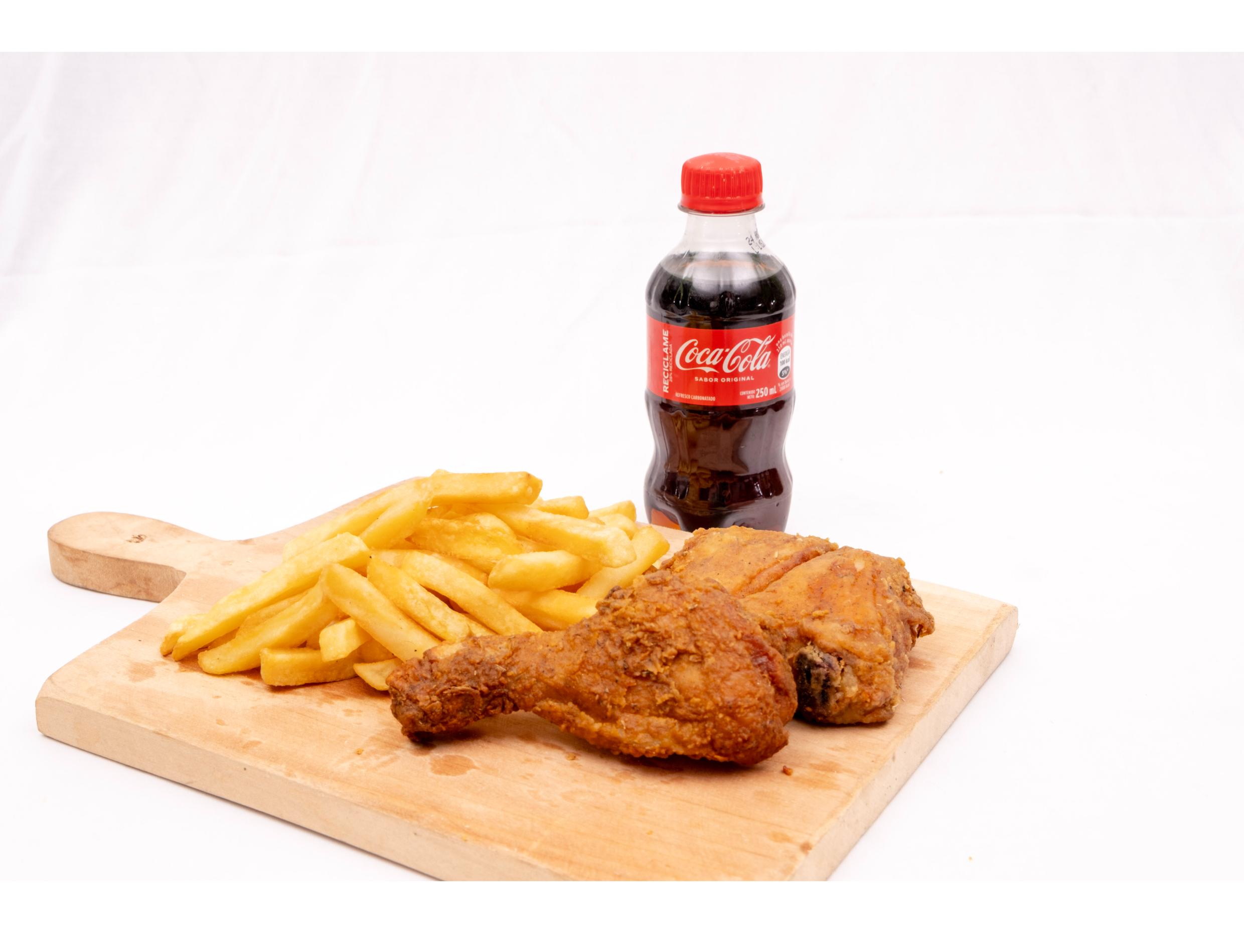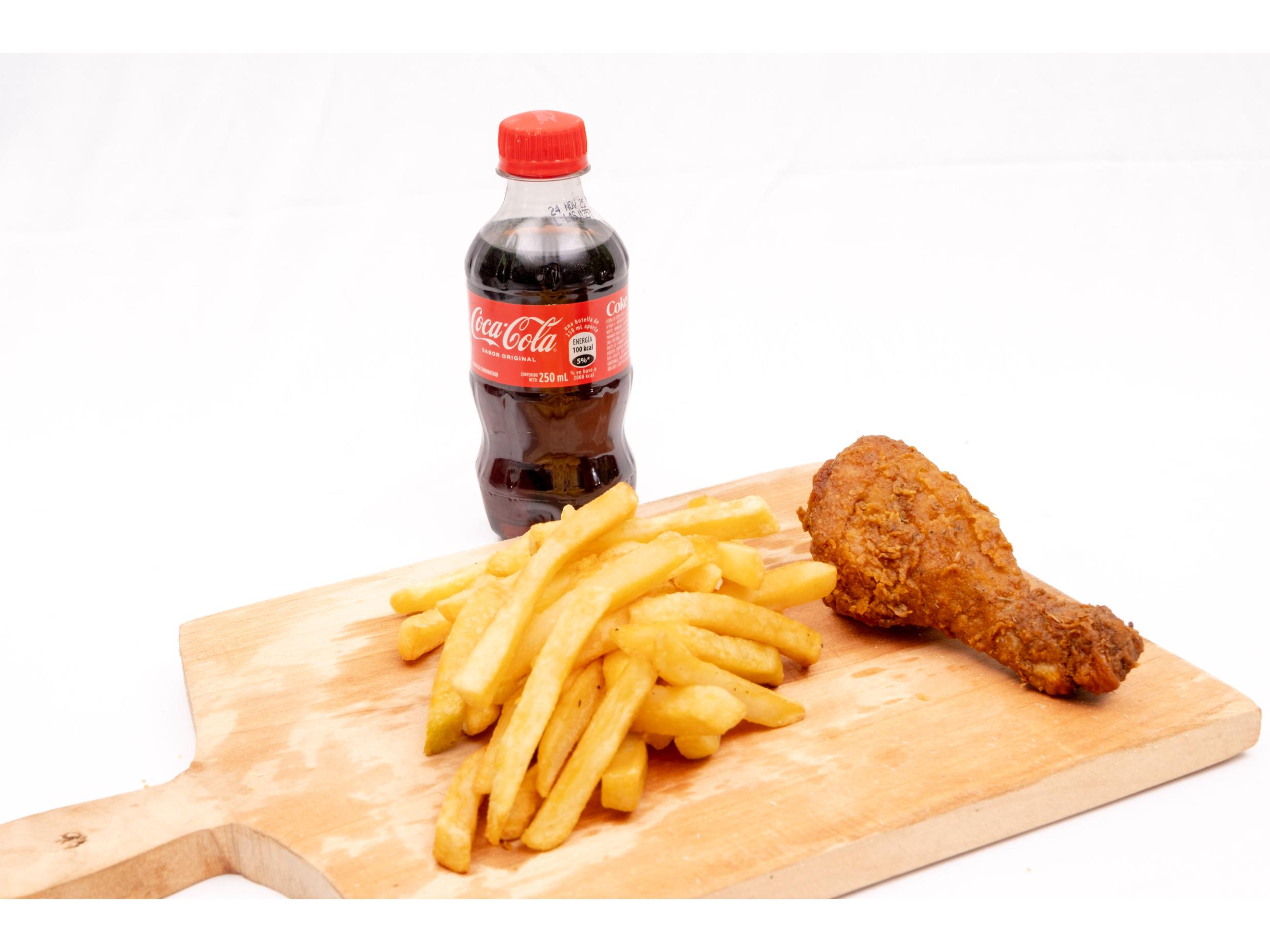 Muslo de pollo de frito acompañado de papas fritas y refresco a escoger. En caso de no contar con la bebida seleccionada por inventario, se enviará otra disponible.
