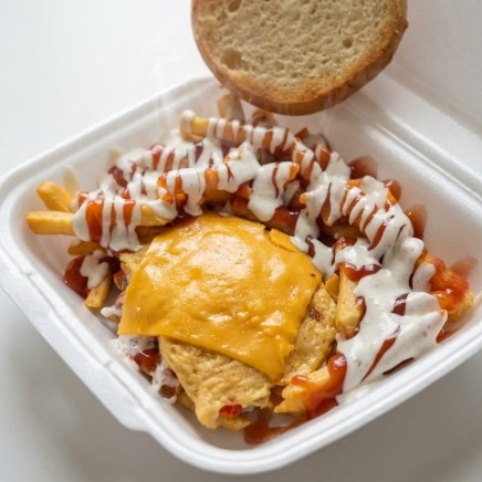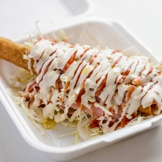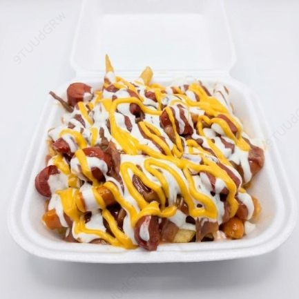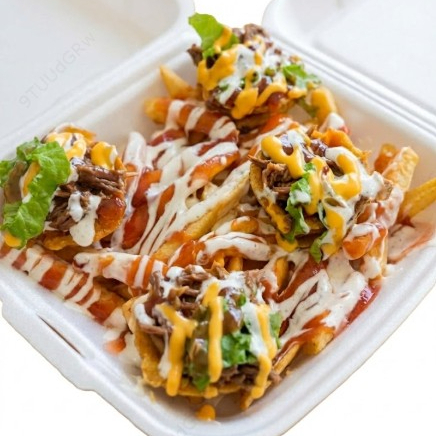 Una explosión de sabor con papas, salchicha y carne desmechada en porción pequeña.