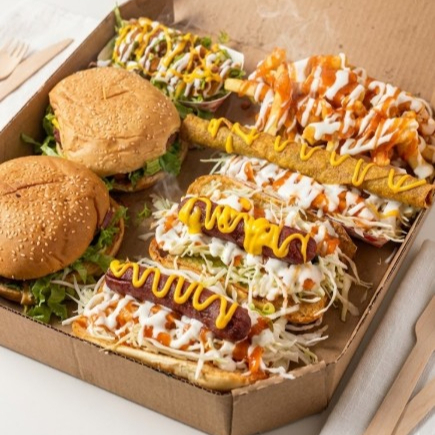 2 Salchipapas, 2 hamburguesas, 1 taco, 2 hot dogs.