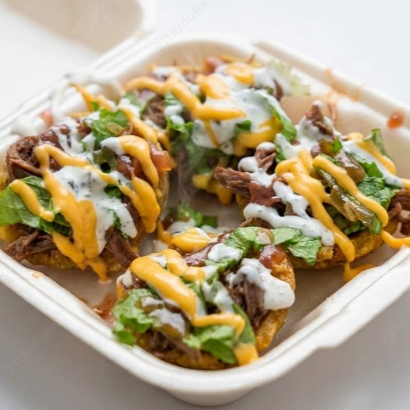 Canasta de patacones con carne mechada y papas fritas