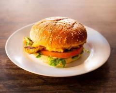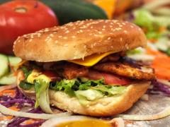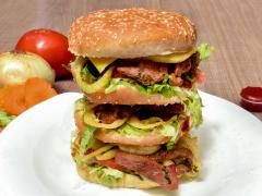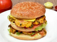 Hamburguesa de pollo con 3 panes y doble porción de pollo a la plancha.
