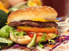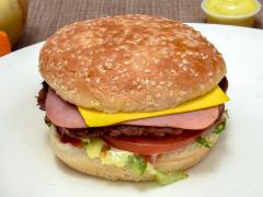 Hamburguesa de res con queso americano y jamón de cerdo.