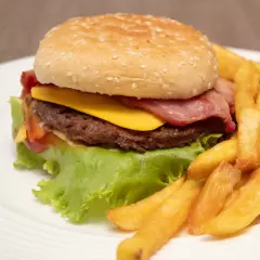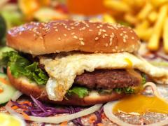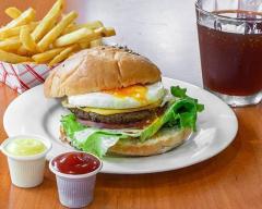 Hamburguesa de res con queso americano y huevo frito, acompañado de bebida de 12 onzas y papas fritas.
