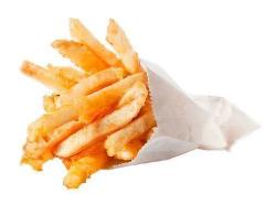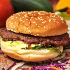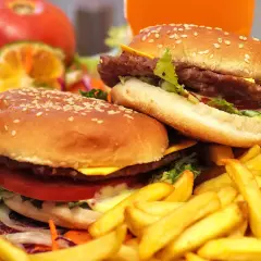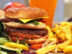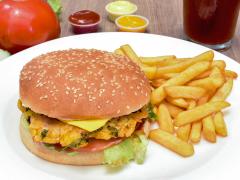 Hamburguesa de res de pollo, con papas fritas y bebida de 12 onzas.