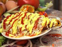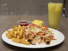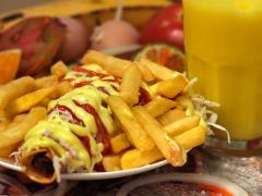Arreglado con repollo y salsas (tomate y mayonesa) con papas fritas y bebida de 12 onzas.