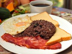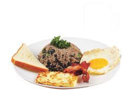 Gallo pinto, tocineta, huevo frito, pan, queso blanco y bebida caliente.