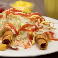 Burrito de carne de res o pollo arreglado con salsas (tomate y mayonesa), lechuga y chimichurri.