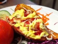 Empanada abierta con repollo y lechuga, salsas (tomate y mayonesa) y pollo.