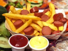 Dos porciones de salchipapas con papas fritas crujientes y salchichas, acompañadas de las salsas que más te gusten. ¡Ideal para picar y compartir!