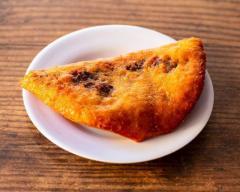 Empanada crujiente rellena de carne sazonada, acompañada de repollo fresco, salsas y el toque clásico tico que encanta.