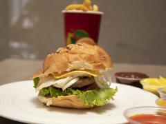 Hamburguesa de res con queso americano y huevo frito, acompañado de bebida de 12 onzas y papas fritas.