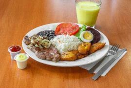 Arroz, frijoles negros enteros, ensalada de la casa (lechuga y tomate) y carne de acompañamiento, incluye una bebida.