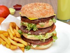 Hamburguesa de res triple, con papas fritas y bebida de 12 onzas.