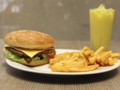 Hamburguesa de res con queso americano americano, papas fritas y bebida de 12 onzas.