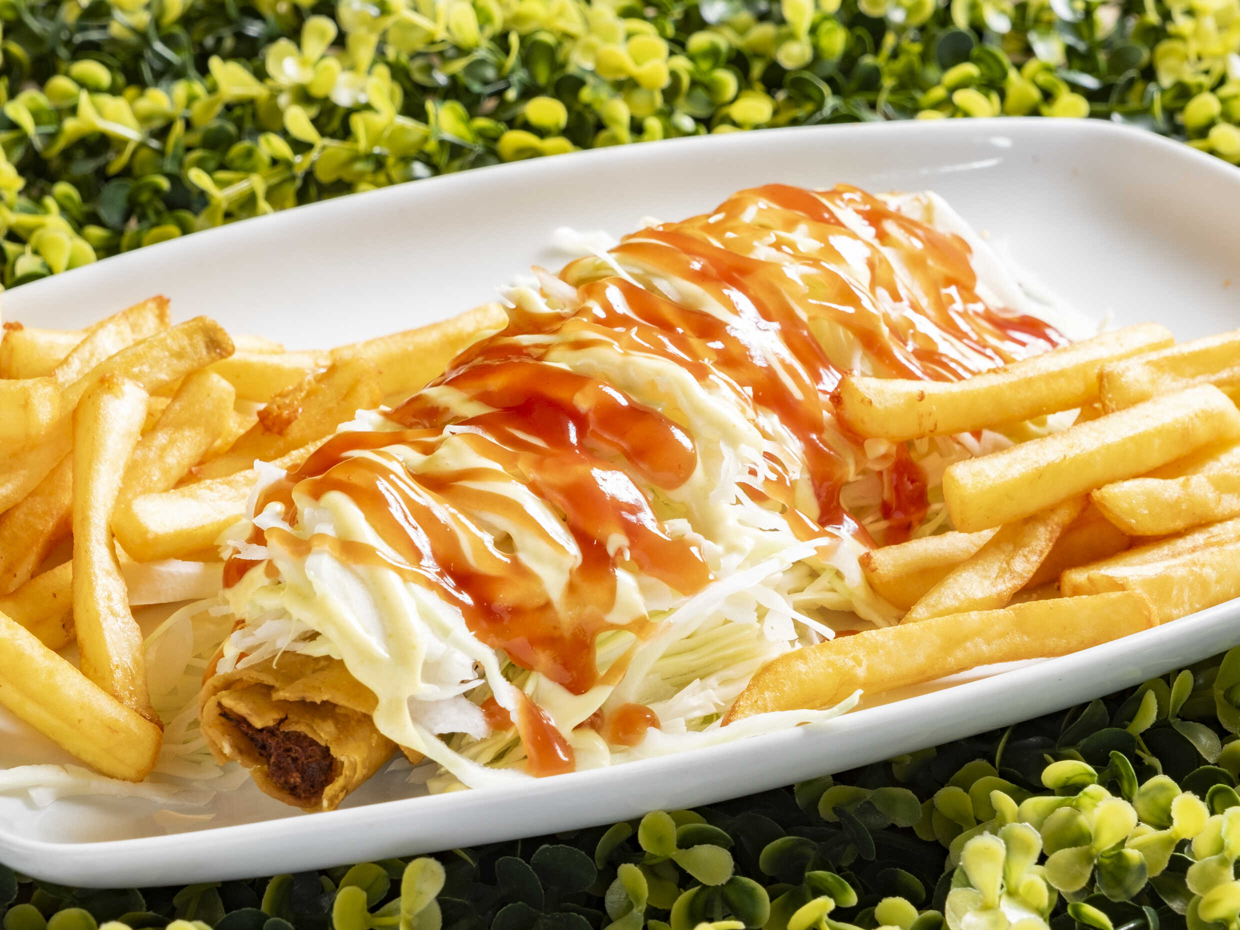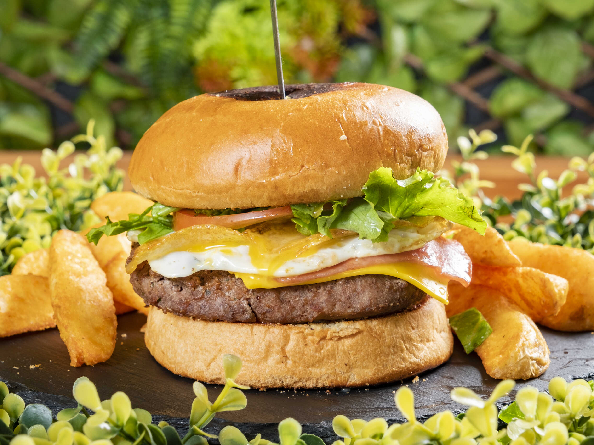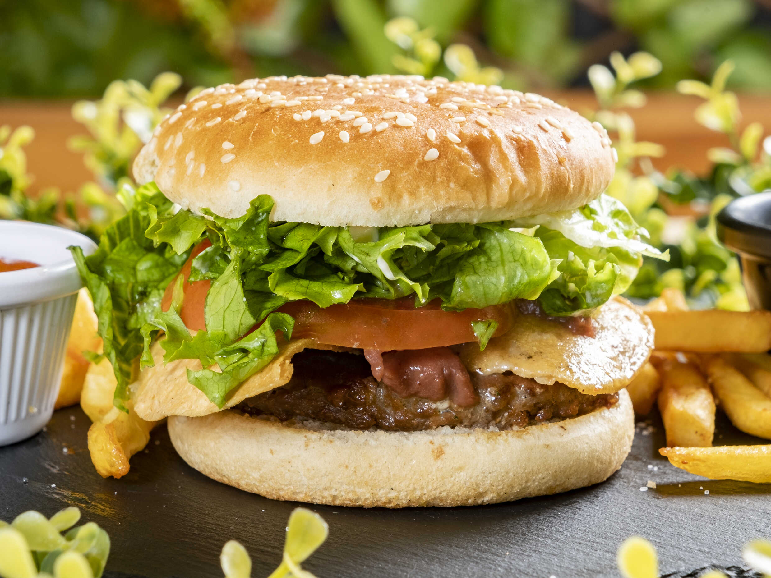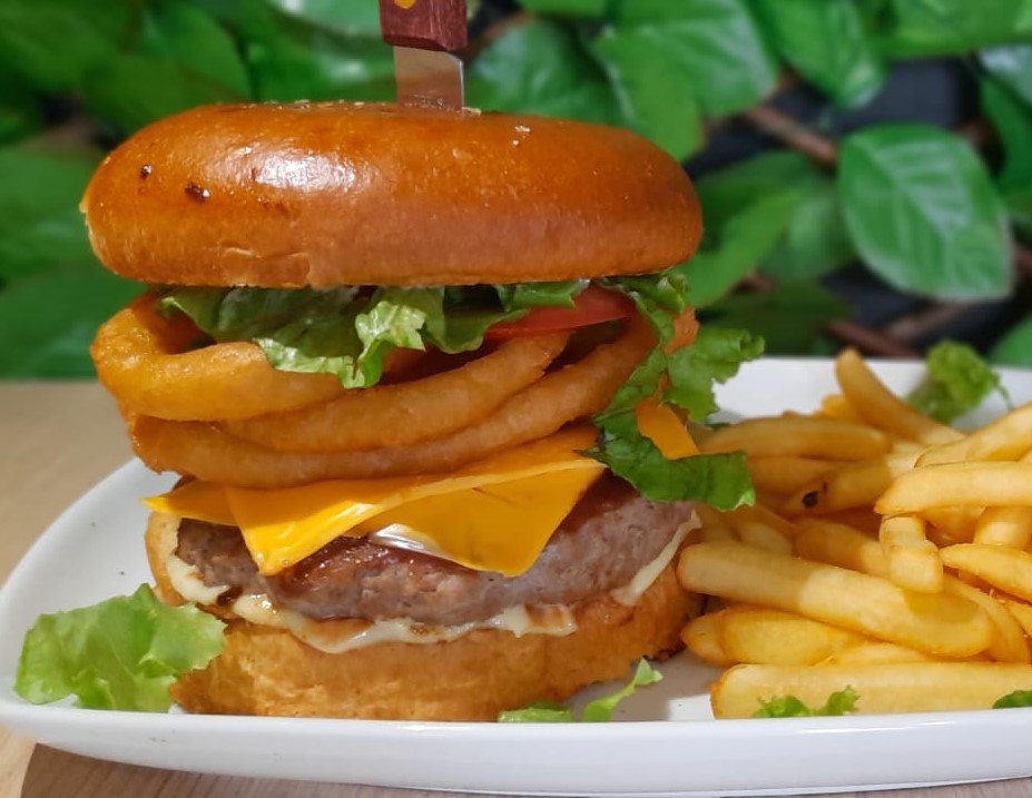 Lechuga, tomate, aros de cebolla, queso amarillo y salsa BBQ.
