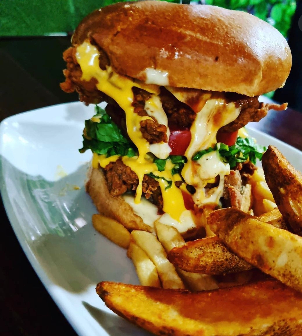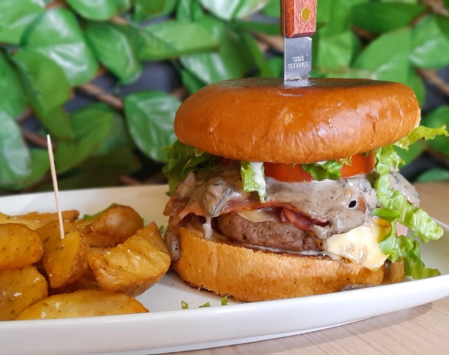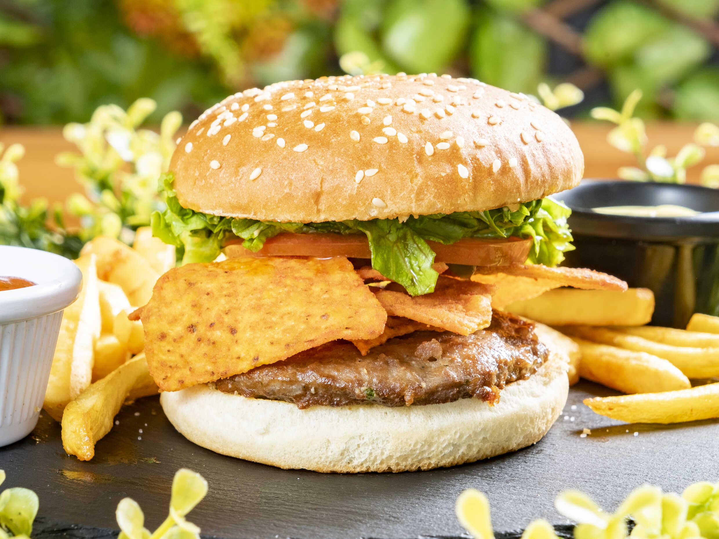 Carne artesanal, salsa chipotle, lechuga, tomate y bravos.