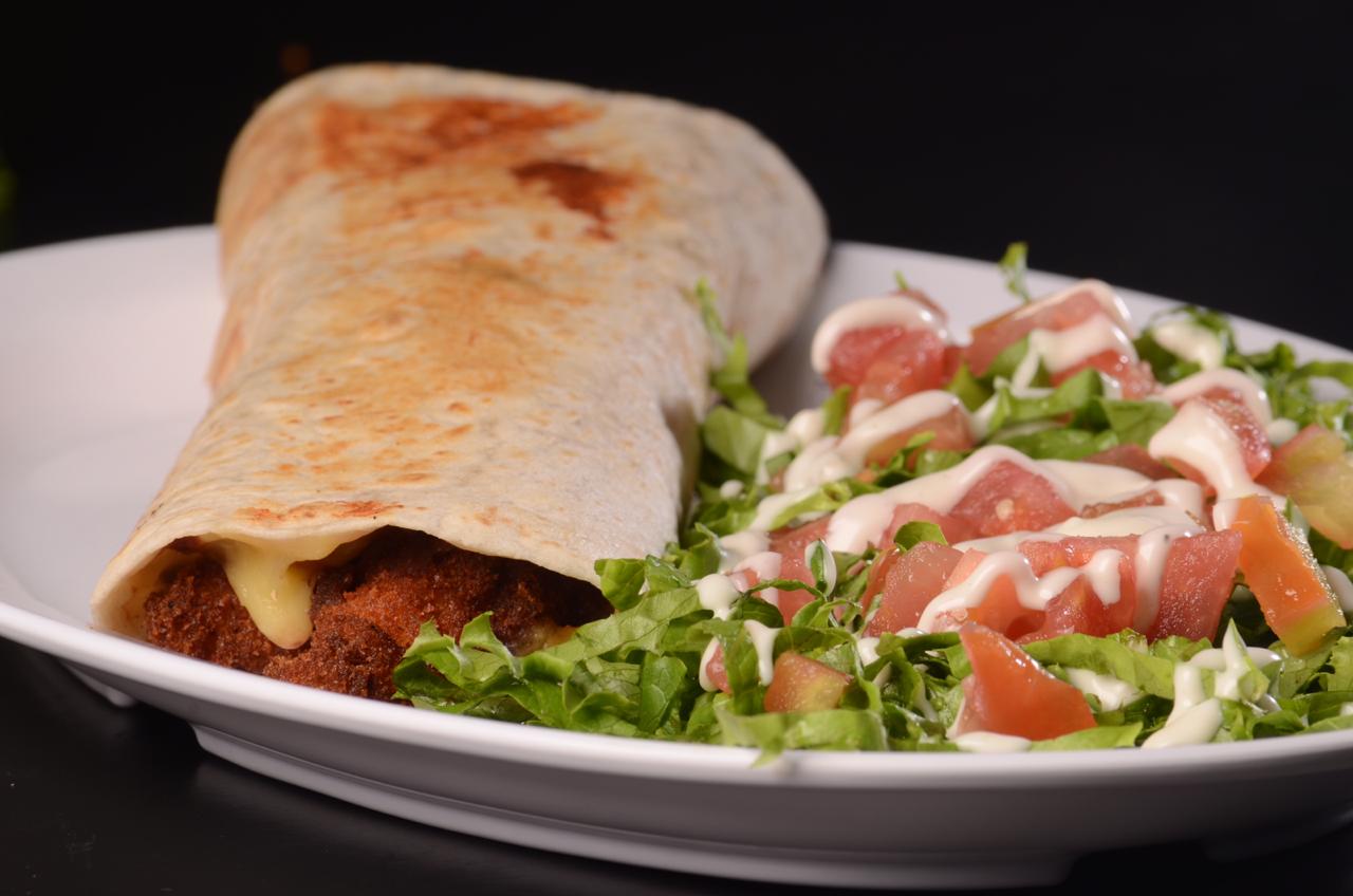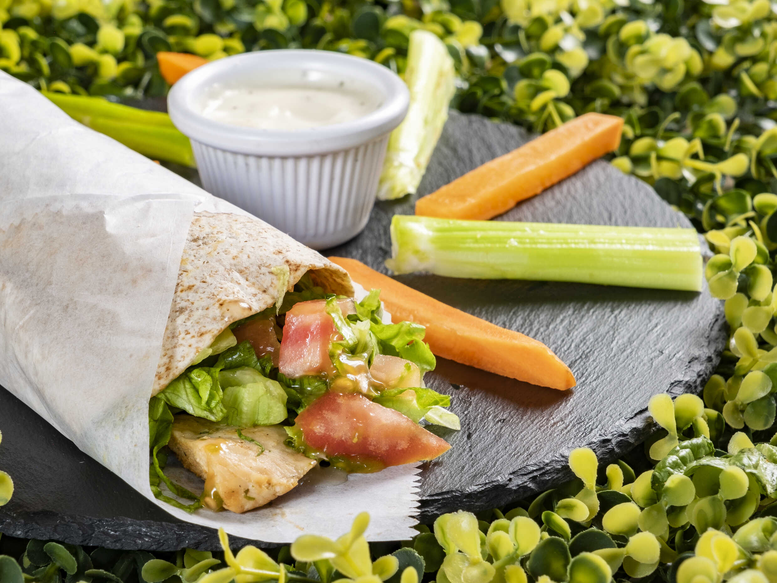Tortilla integral, pollo a la plancha, aderezo ligth, cebolla Morada, lechuga, tomate acompañado de Apio y zanahoria