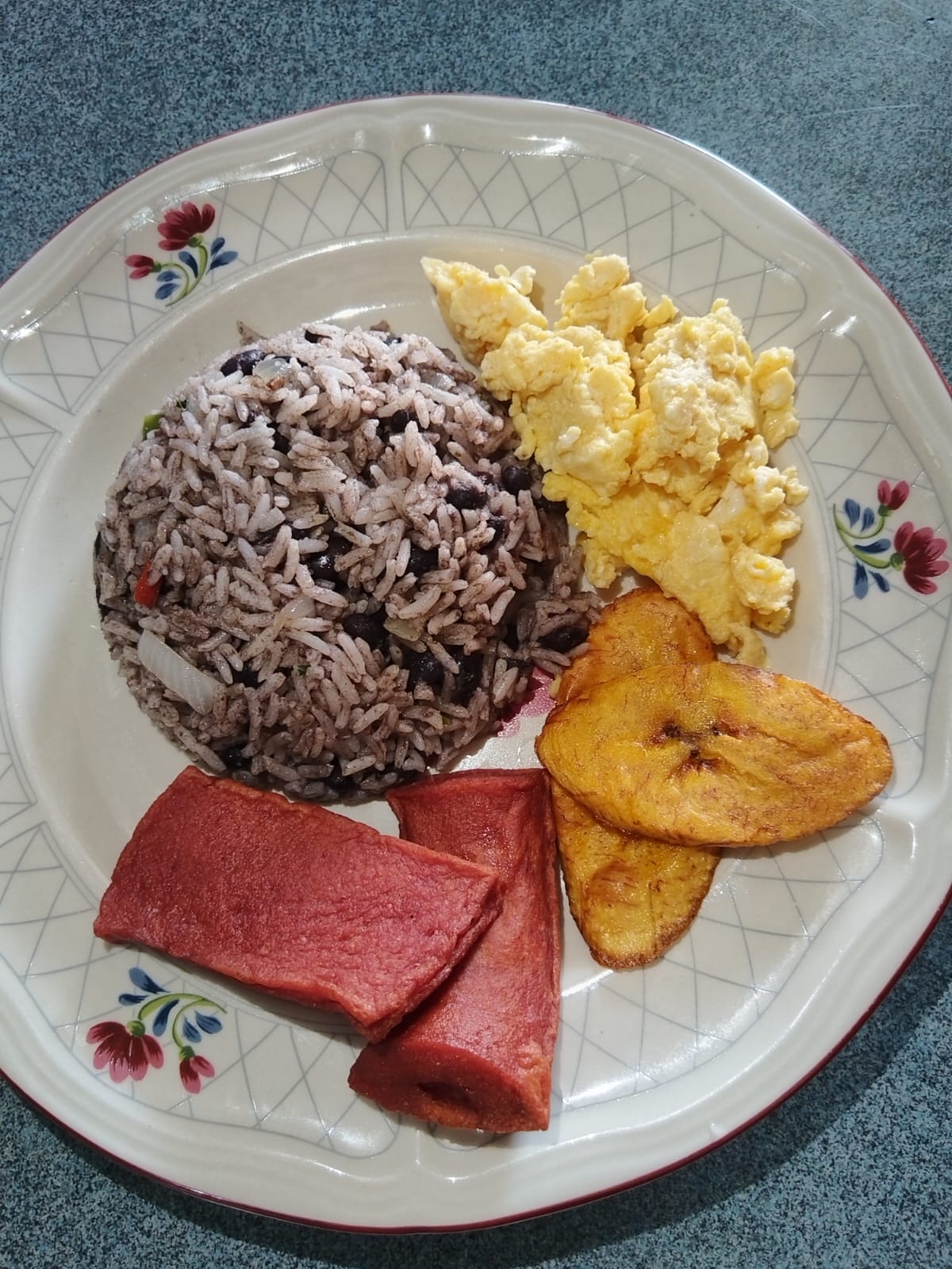 Gallo pinto con huevo picado, plátano maduro y salchichón.