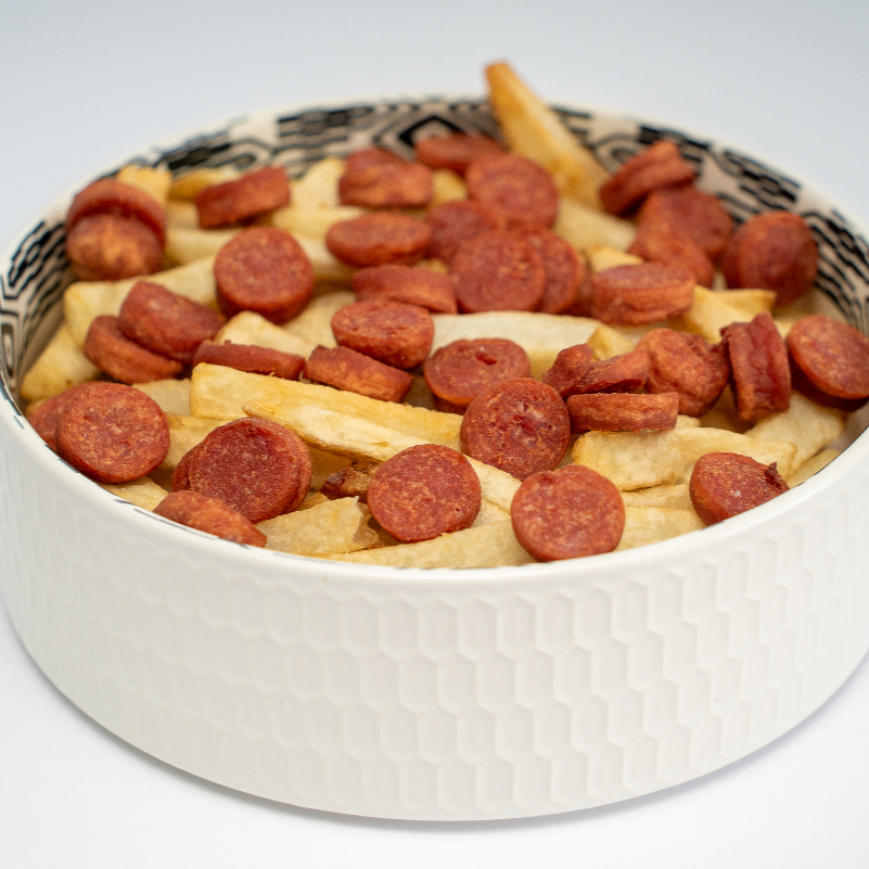 Papas fritas naturales, salchichas, ketchup, mayonesa artesanal y queso cheddar
