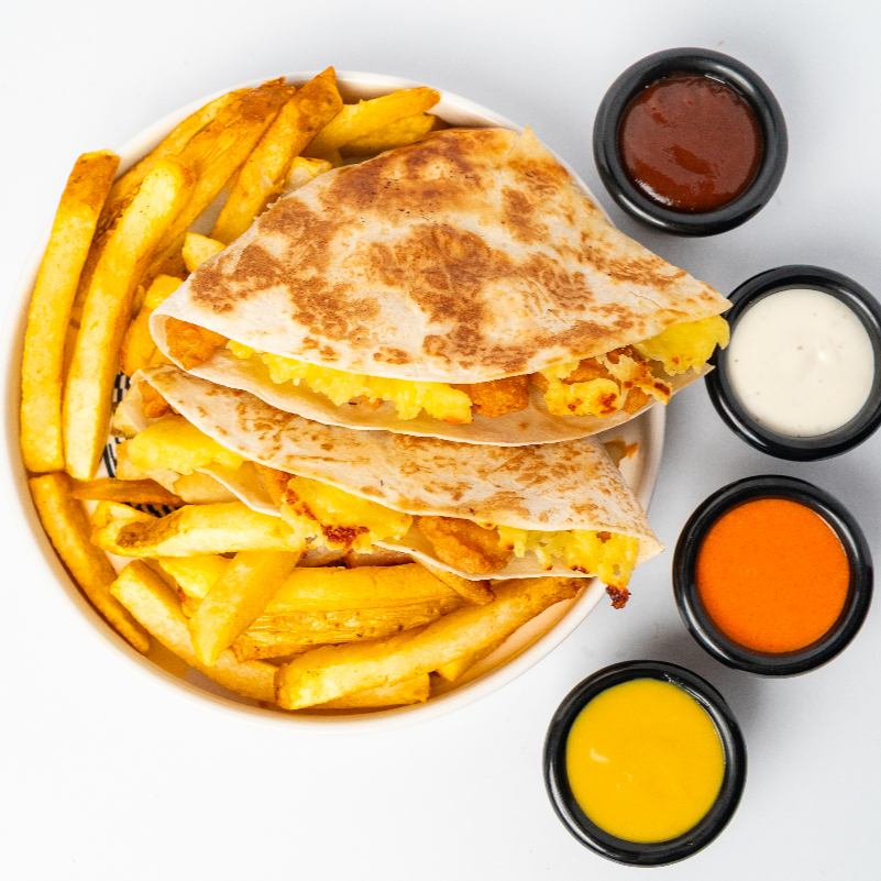 Tortilla de harina, mix de quesos. Salsa a elegir. Incluye papas fritas naturales, ketchup y mayonesa casera.
